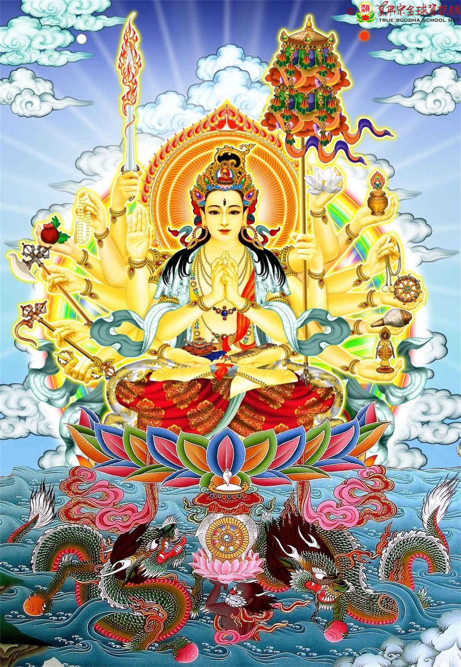 「準提佛母」身為淺黃色,是三目十八臂的大佛母,戴寶冠,寶冠中有一化佛。佛母臂戴瓔珞,白色的天衣。