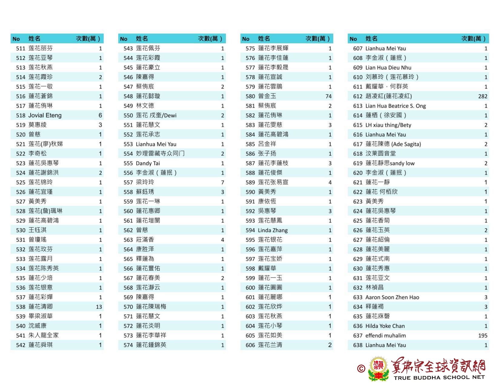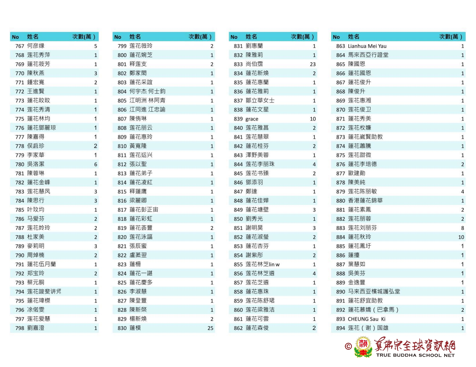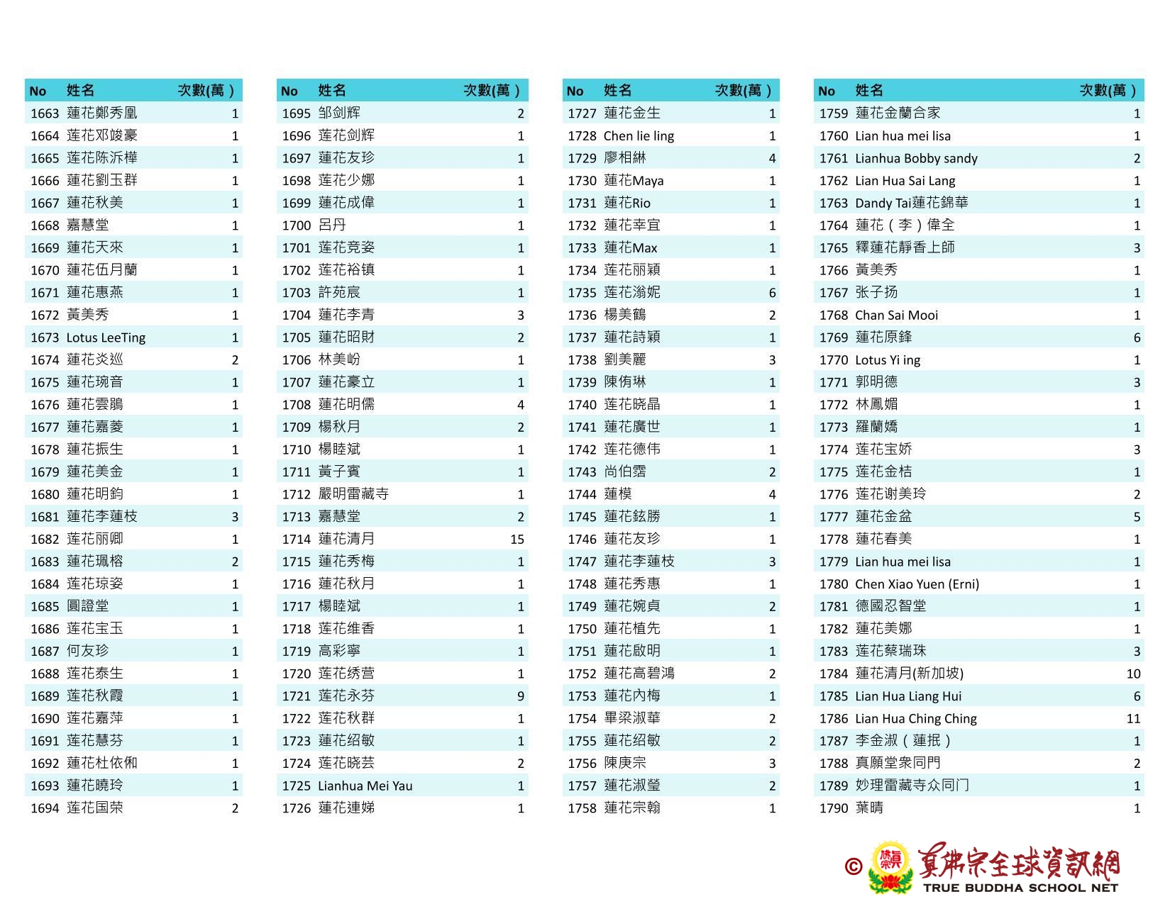 持誦金母心咒迴向師佛 全球真佛弟子一心持誦瑤池金母心咒 祈求瑤池金母大天尊光明守護師佛。 截至2025/05/25日傍晚,持誦瑤池金母心咒累積數目已達5906萬遍,在此呈上目前所登記於真佛宗全球資訊網TBSN的名單。 感謝所有持咒迴向的同門!讓我們再接再厲,以千萬遍金母心咒,向慈悲的無極瑤池金母大天尊祈求,集氣迴向 師佛安康無恙,自在任運! 持咒登記處: https://ch.tbsn.org/event/blessing2025
