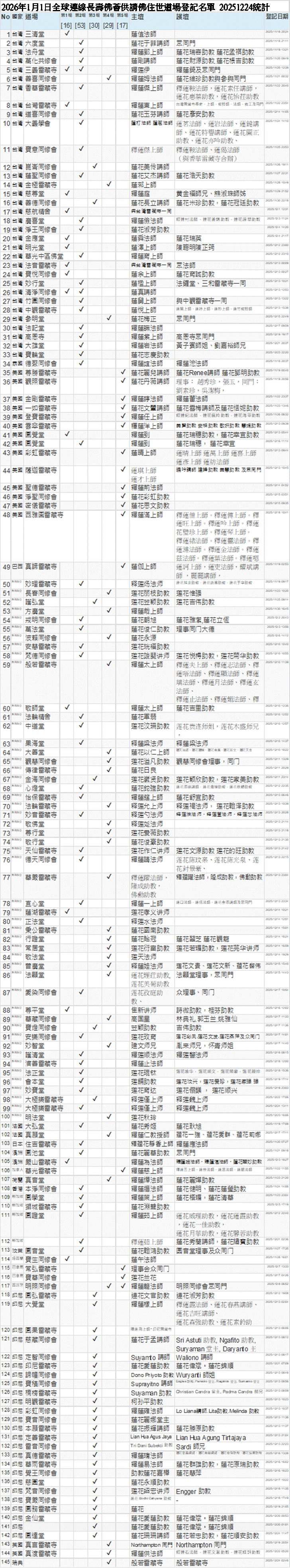 2026/1/1 「南無長壽佛薈供請佛住世」暨「為世界祈福」全球雲端連線大法會薈供道場名單(截至2025/12/24)