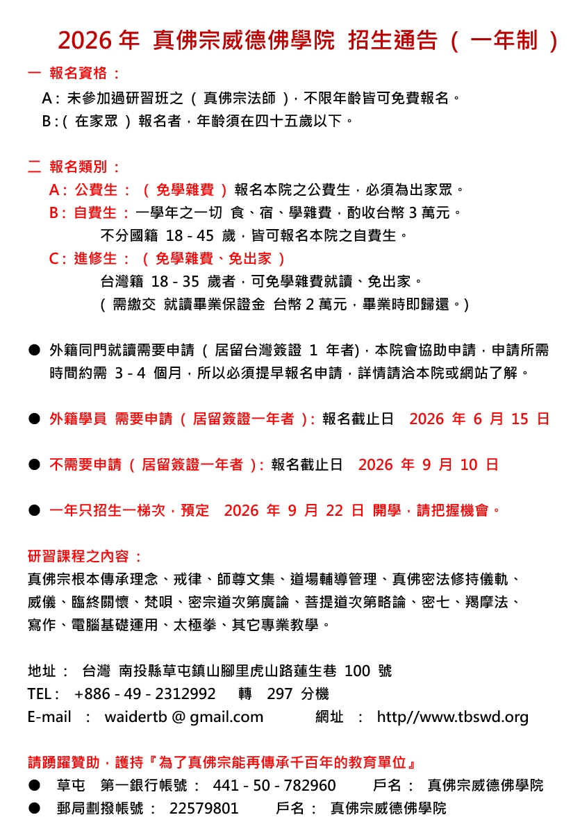 2026年 真佛宗威德佛學院 招生通告(一年制 )