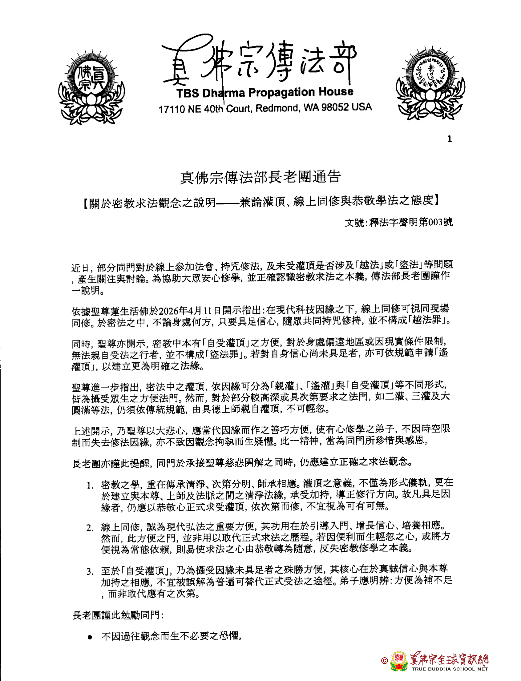 長老團亦謹此提醒,同門於承接聖尊慈悲開解之同時,仍應建立正確之求法觀念。