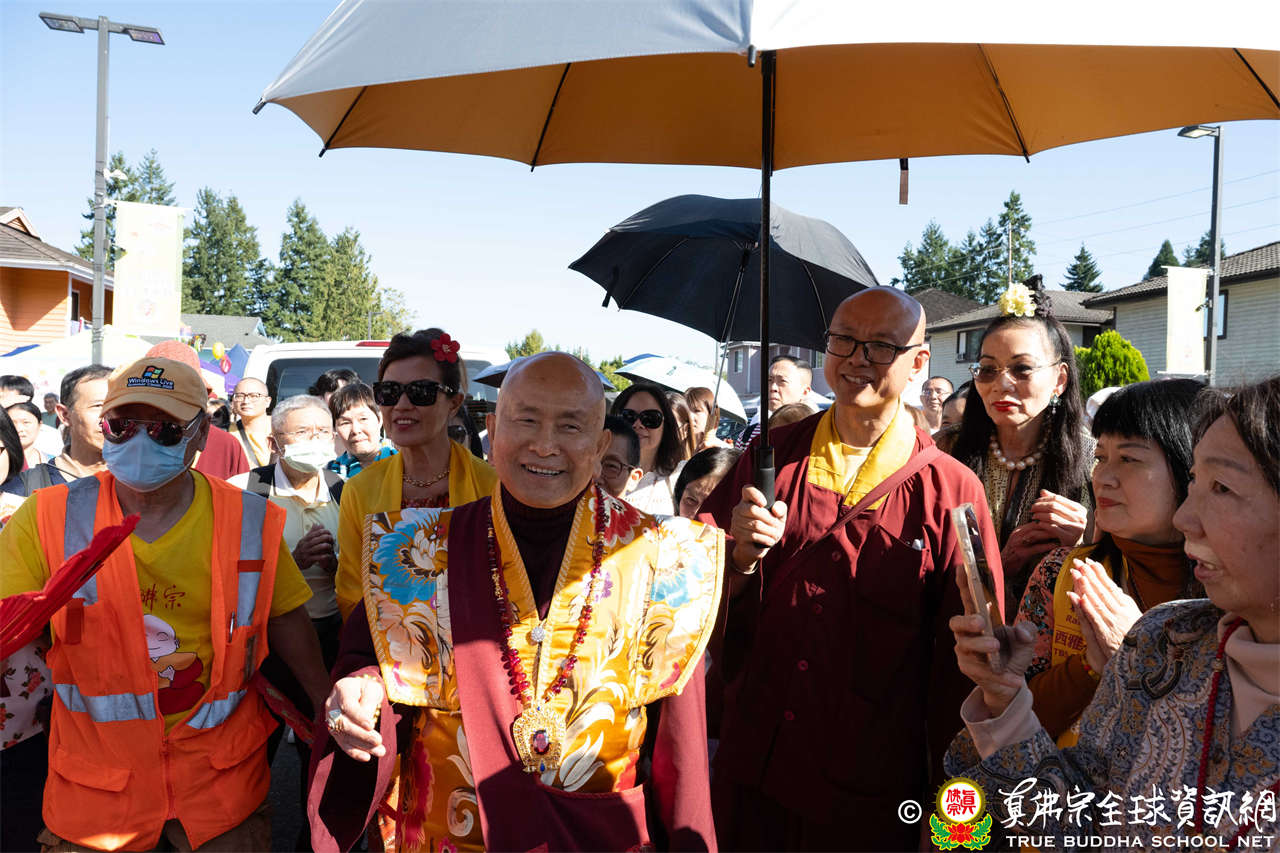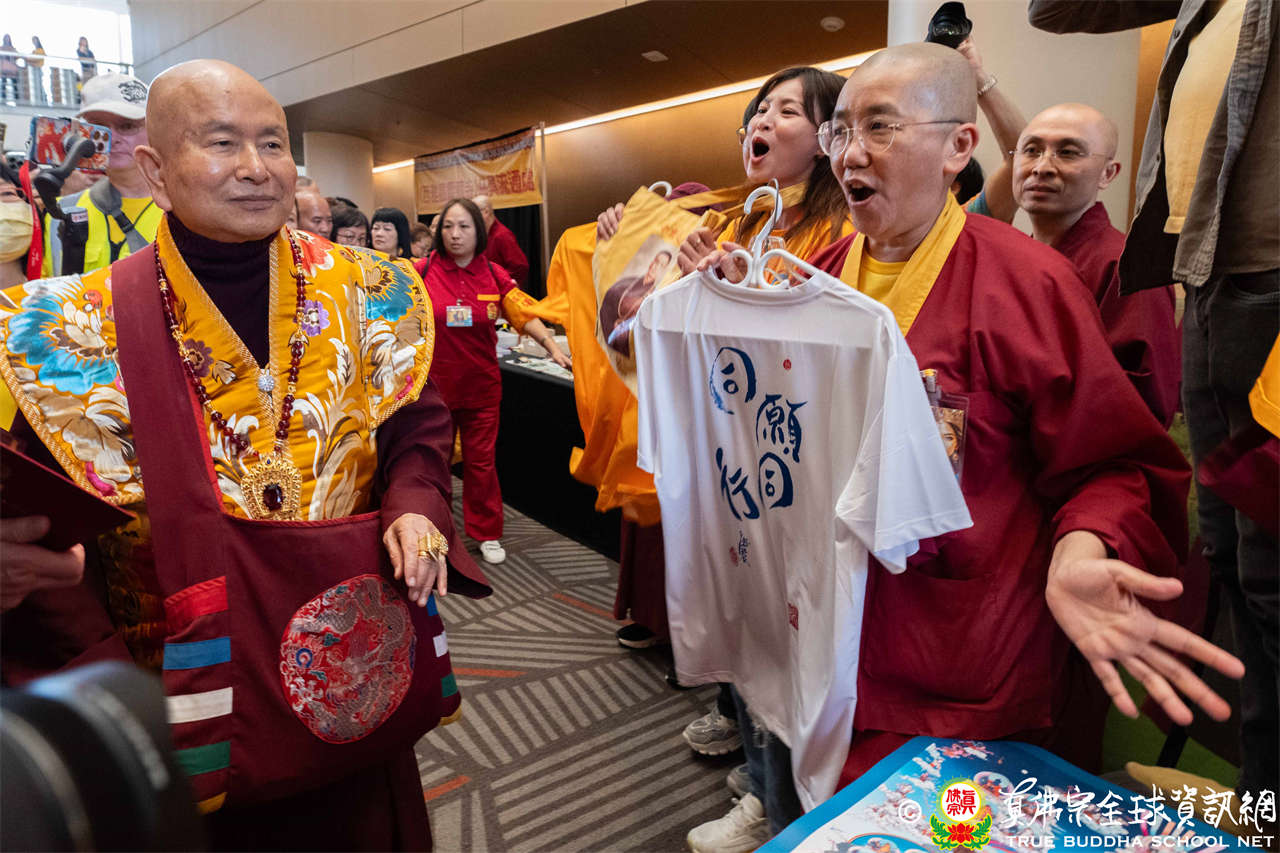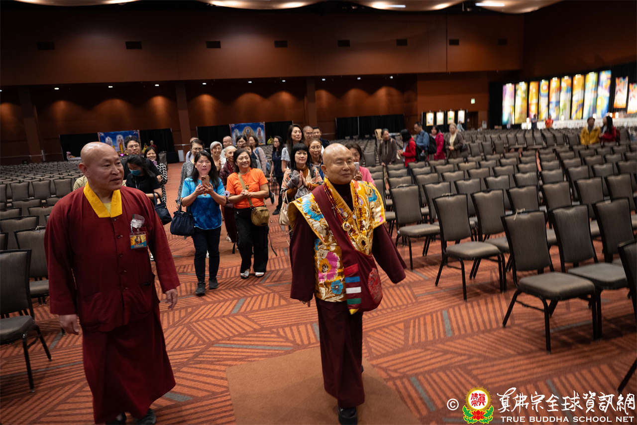 下午一時十五分,聖尊抵達會場,在擁擠的人潮中,一一加持各攤位及報名處。弟子們恭敬讓道,滿懷欣喜與孺慕之情。