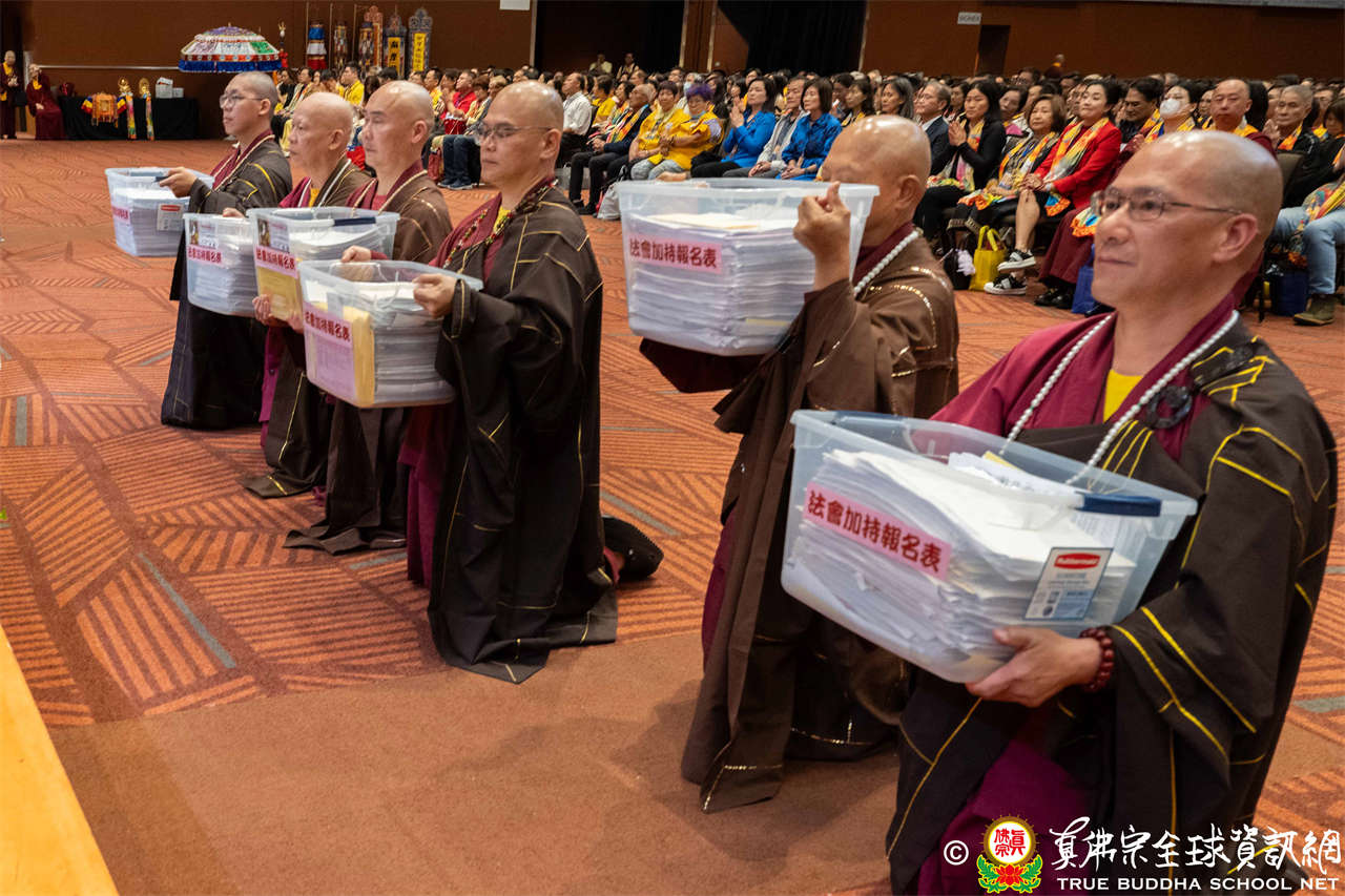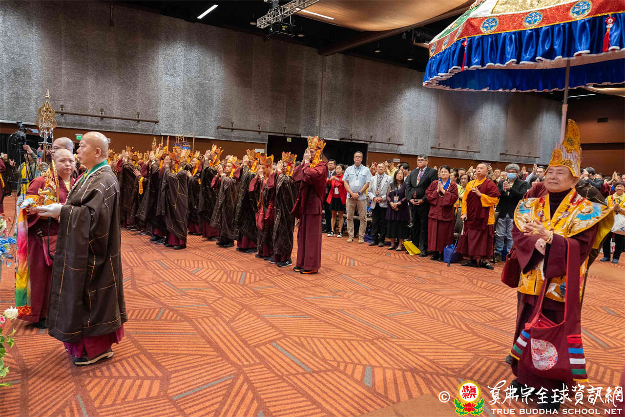 下午二時整,磬聲悠揚響起,四眾弟子虔誠合掌唱誦蓮花童子心咒,恭迎根本傳承上師聖尊蓮生活佛入壇場,眾等跟隨聖尊向佛菩薩與護法諸尊做大禮拜,法會正式揭開序幕。