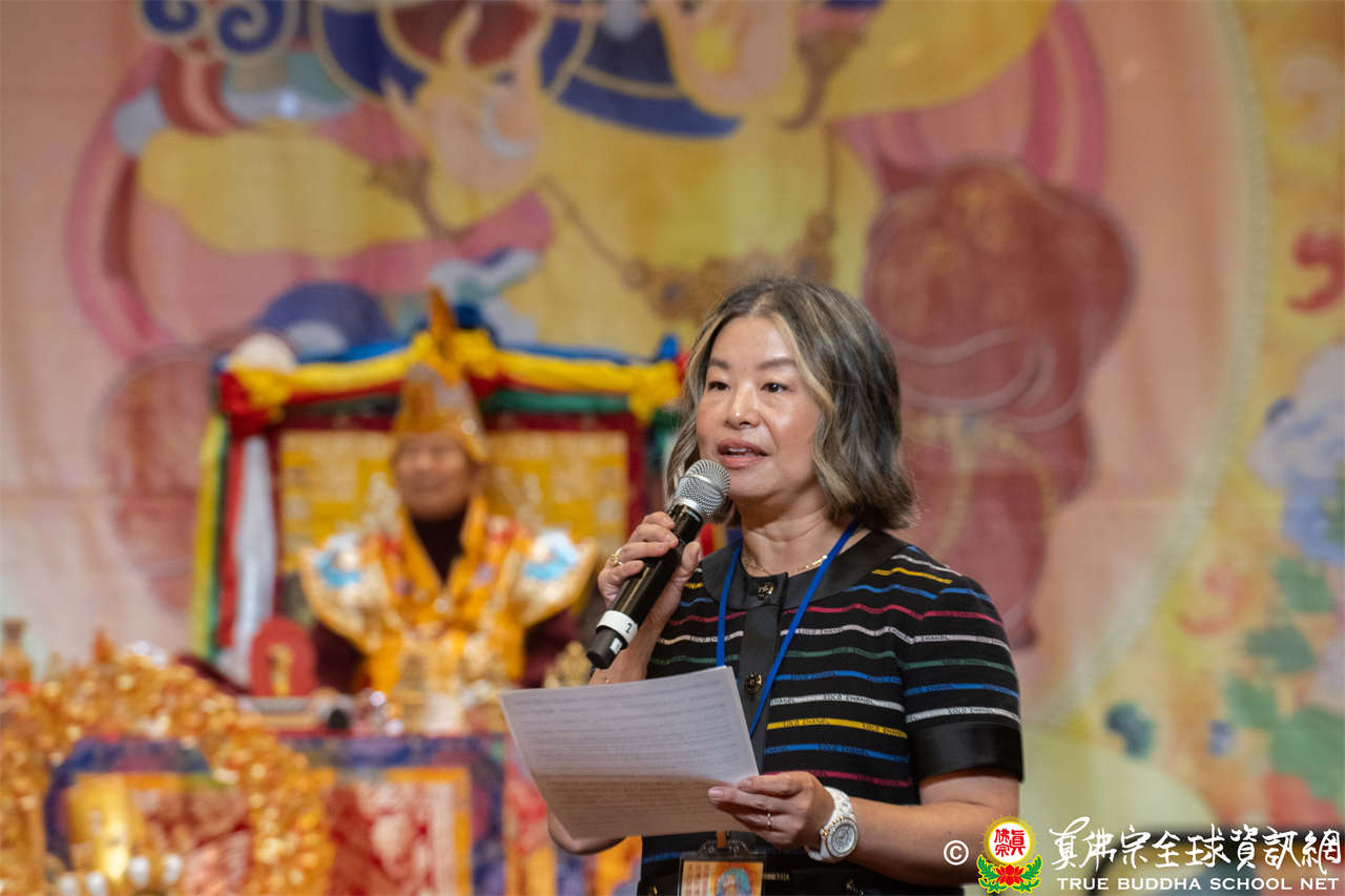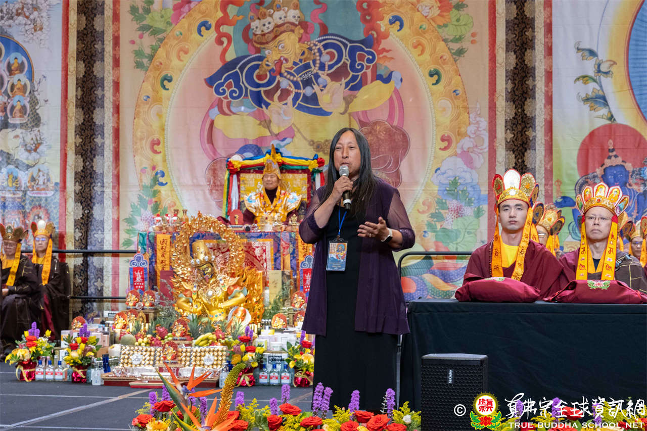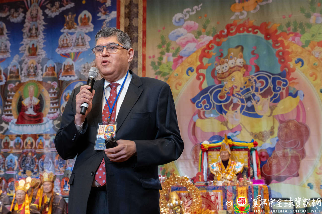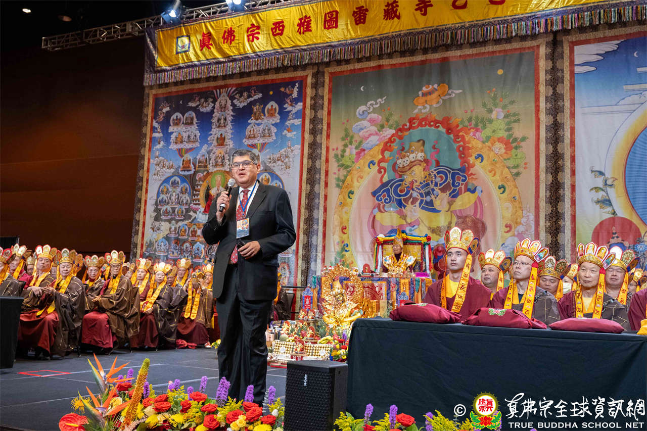 Bellevue市議員Jared Nieuwenhuis致詞時表示,蓮生活佛創立西雅圖雷藏寺所舉行的秋季大法會,是一個開啟新世界、弘揚佛法的時刻,雷藏寺散發著密教的智慧與慈悲的光芒,願我們共同祈禱,為世界帶來光明與和諧。
