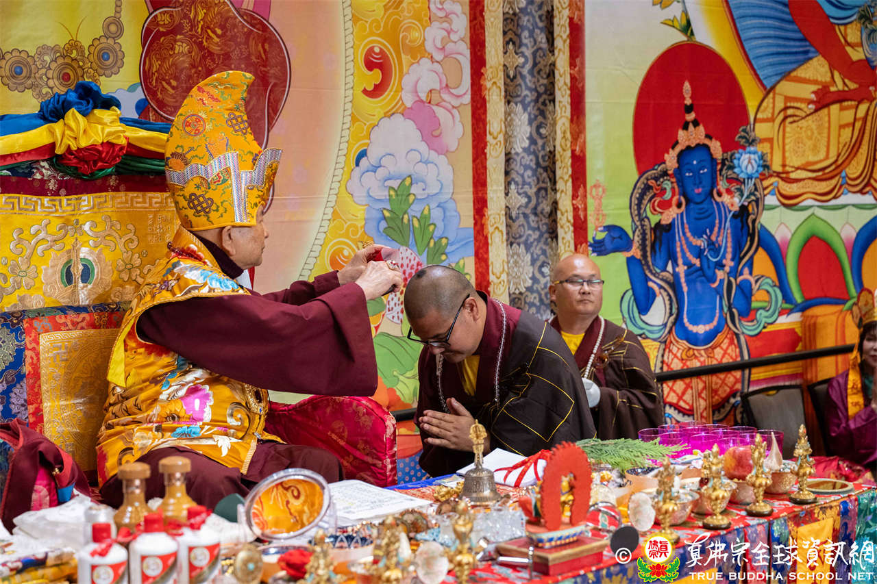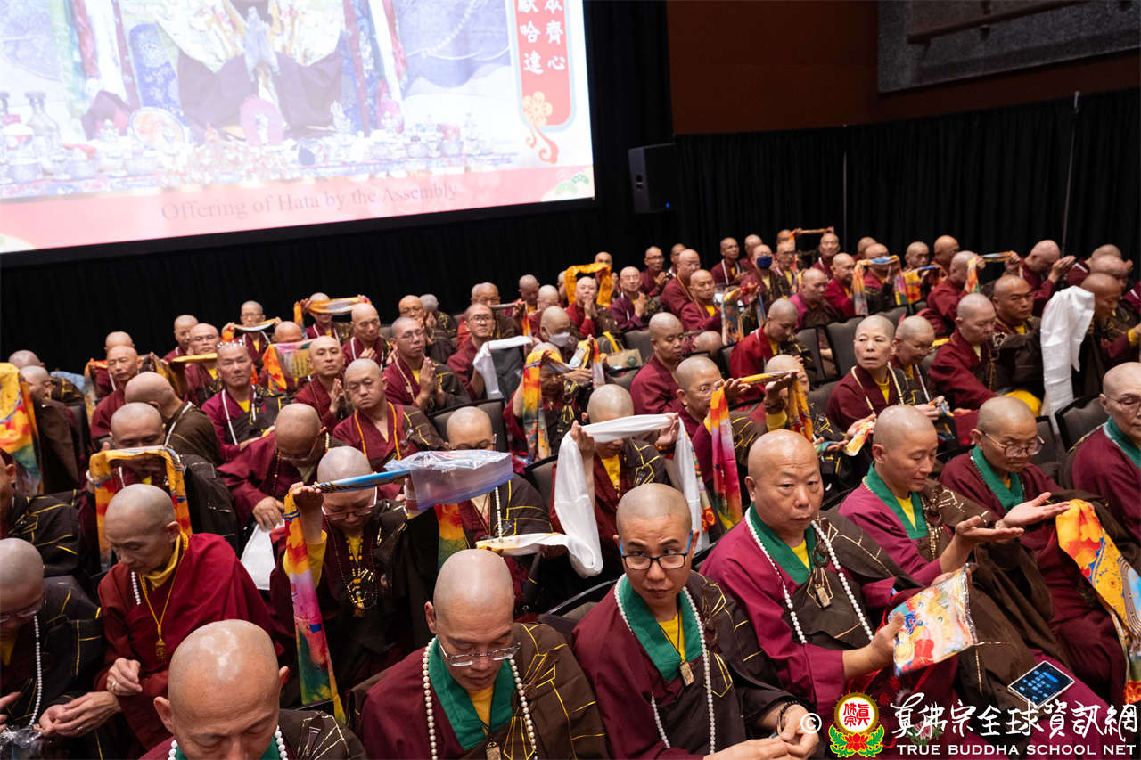 西雅圖雷藏寺住持釋蓮吟上師代表四眾向聖尊敬獻哈達,同時,與會眾等齊舉手中哈達以觀想敬獻於聖尊,秋季大法會開始進入阿彌陀佛密法的修持儀軌。