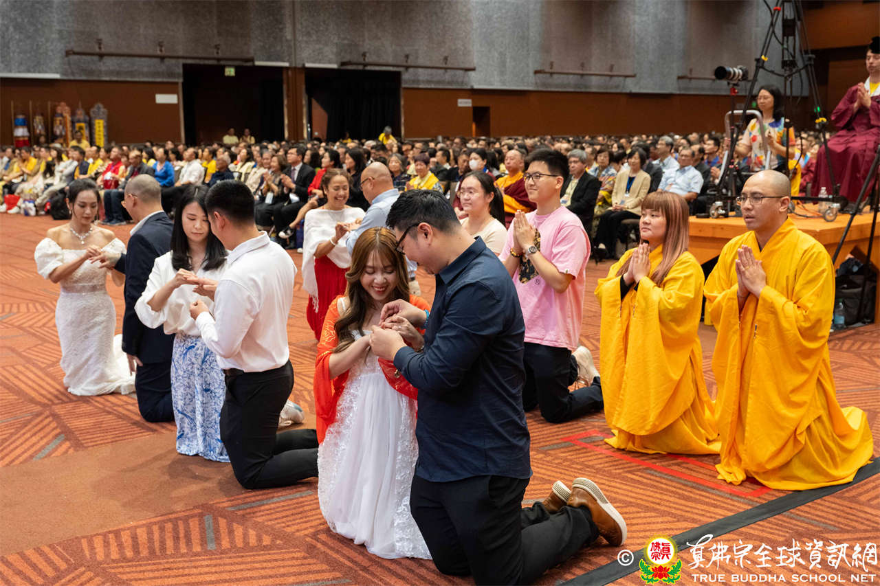 接著,聖尊為六對新人做福證,祝福新人們婚姻美滿、共組佛化家庭。