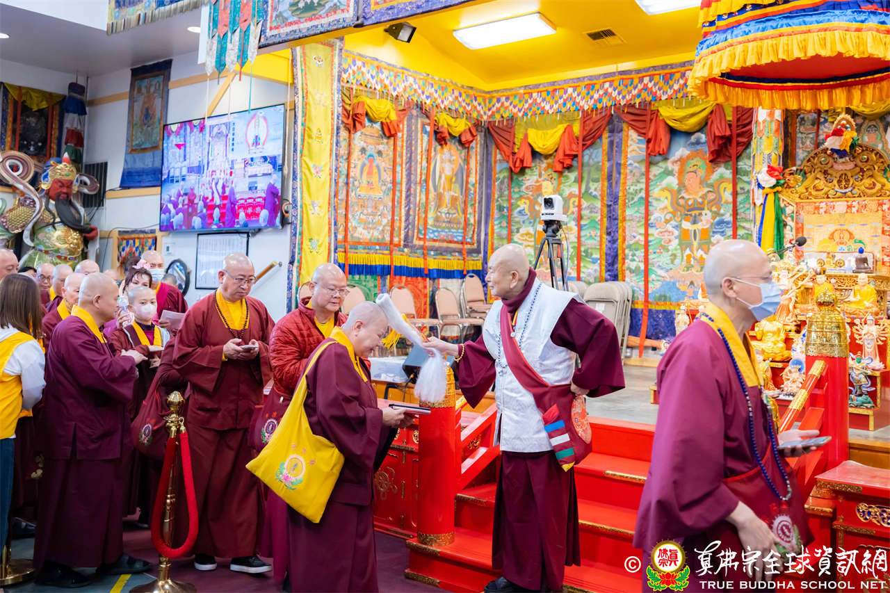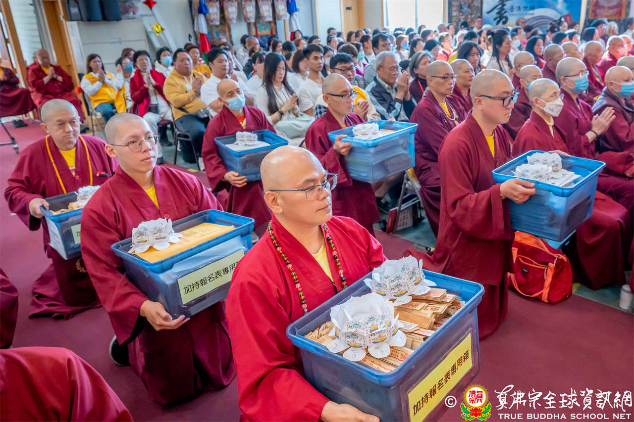 法王開示畢,衆人報以熱烈掌聲感謝法王。接著法王下座與線上弟子互相問候,並為與會大衆賜授大白傘蓋佛母法灌頂。法會至此圓滿結束。