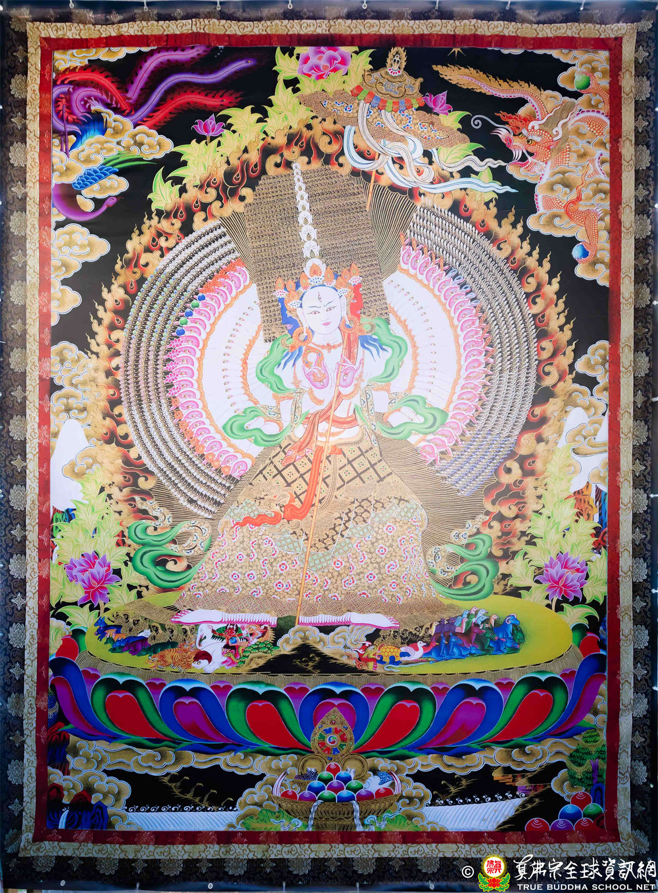 接著法王介紹此次法會主尊大白傘蓋佛母,其功德是:「得日月星斗擁戴、得吉祥賜福、可息、增、懷、誅、能鎮護國家,退怯强敵、遮止地水火風災難,威力無窮。其形象有獨尊的,也有千手千眼大白傘蓋佛母」。