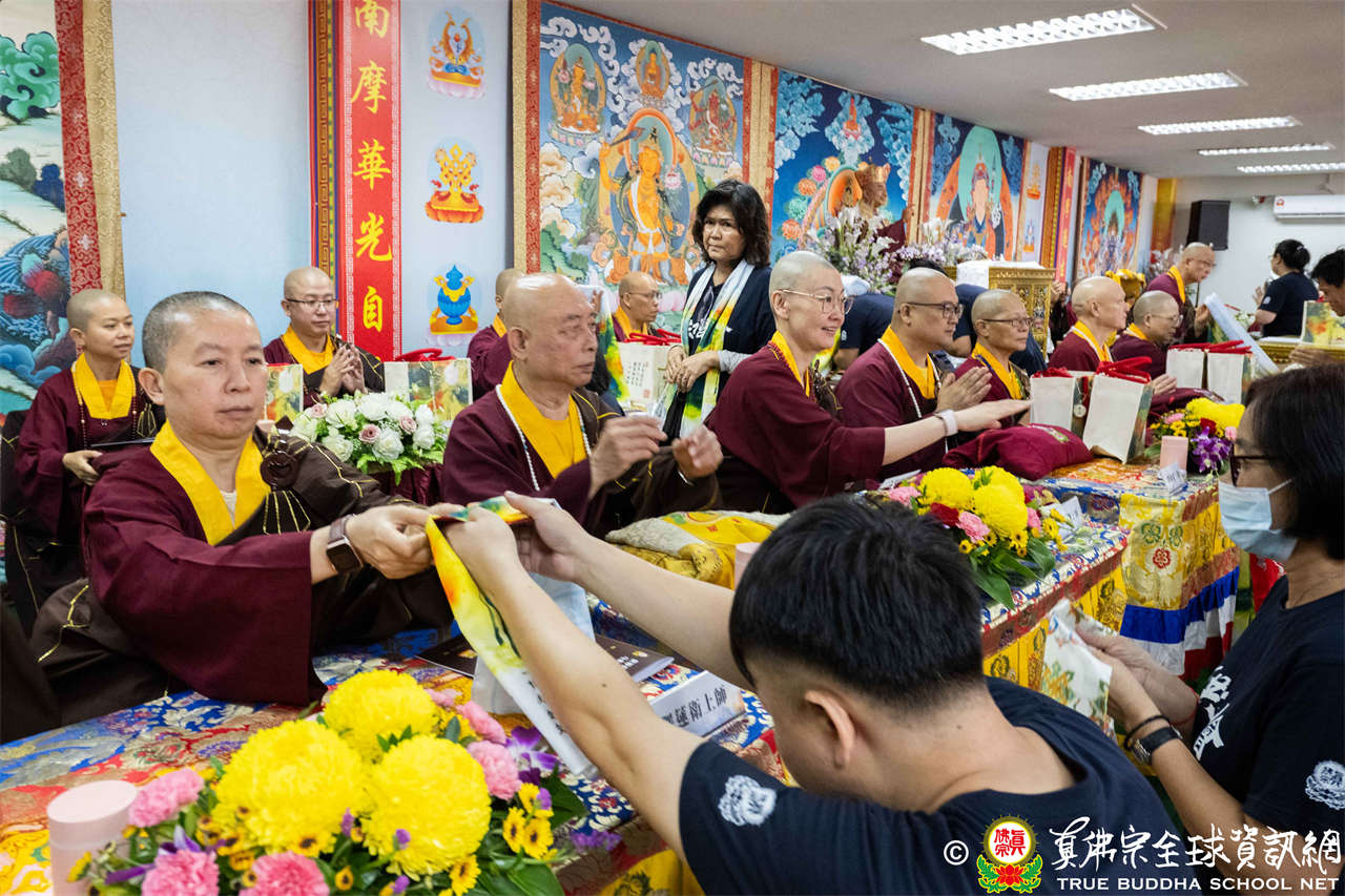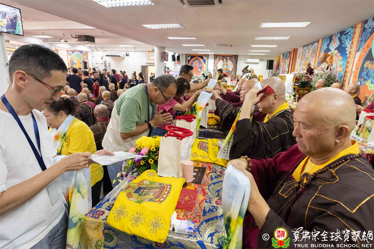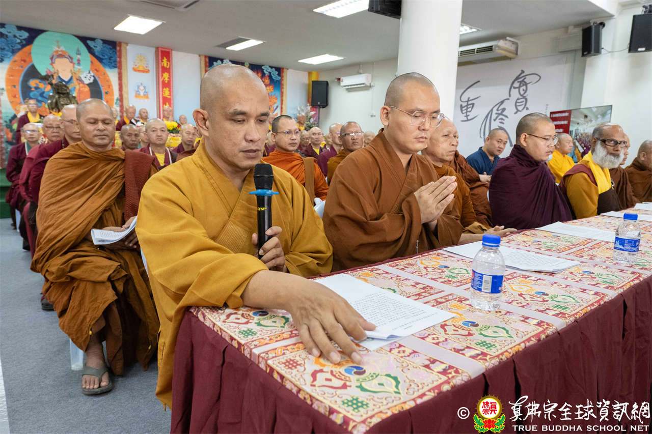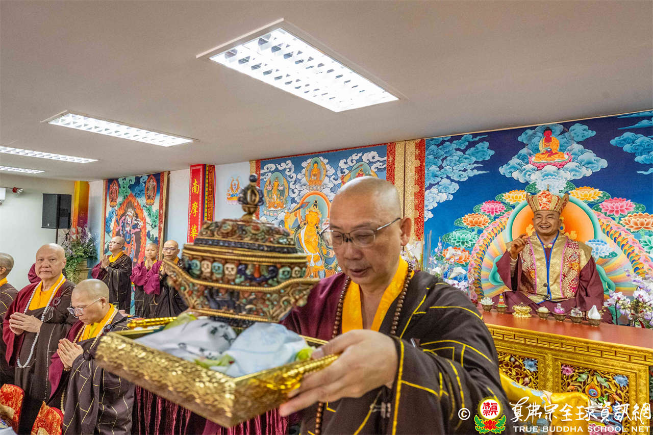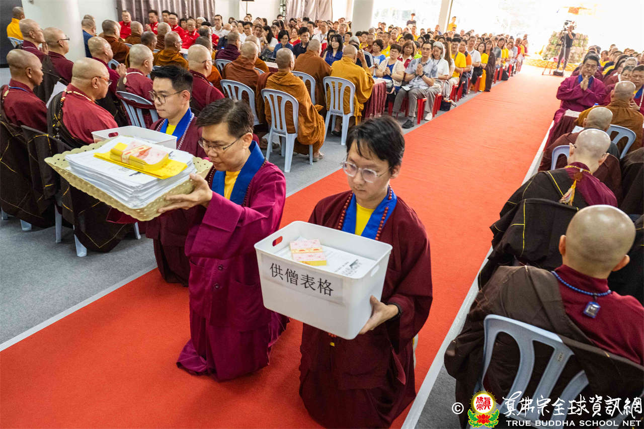 供僧大會依循《真佛宗供僧儀軌》肅穆進行,由長老釋蓮栽上師代表根本上師聖尊蓮生活佛盧勝彥納受信眾供養,並代表供養住世羅漢賓頭盧尊者。全體真佛弟子齊聲念誦《請佛住世祈願文》,祈請根本上師常住世間、永轉法輪;現場亦有南傳僧人持誦巴利文《祈禱文》,北傳僧人念誦《大悲咒》及《心經》。隨後,眾同門善信向僧眾敬獻哈達與供養,並由釋蓮栽長老開示佛法,供僧大會圓滿。