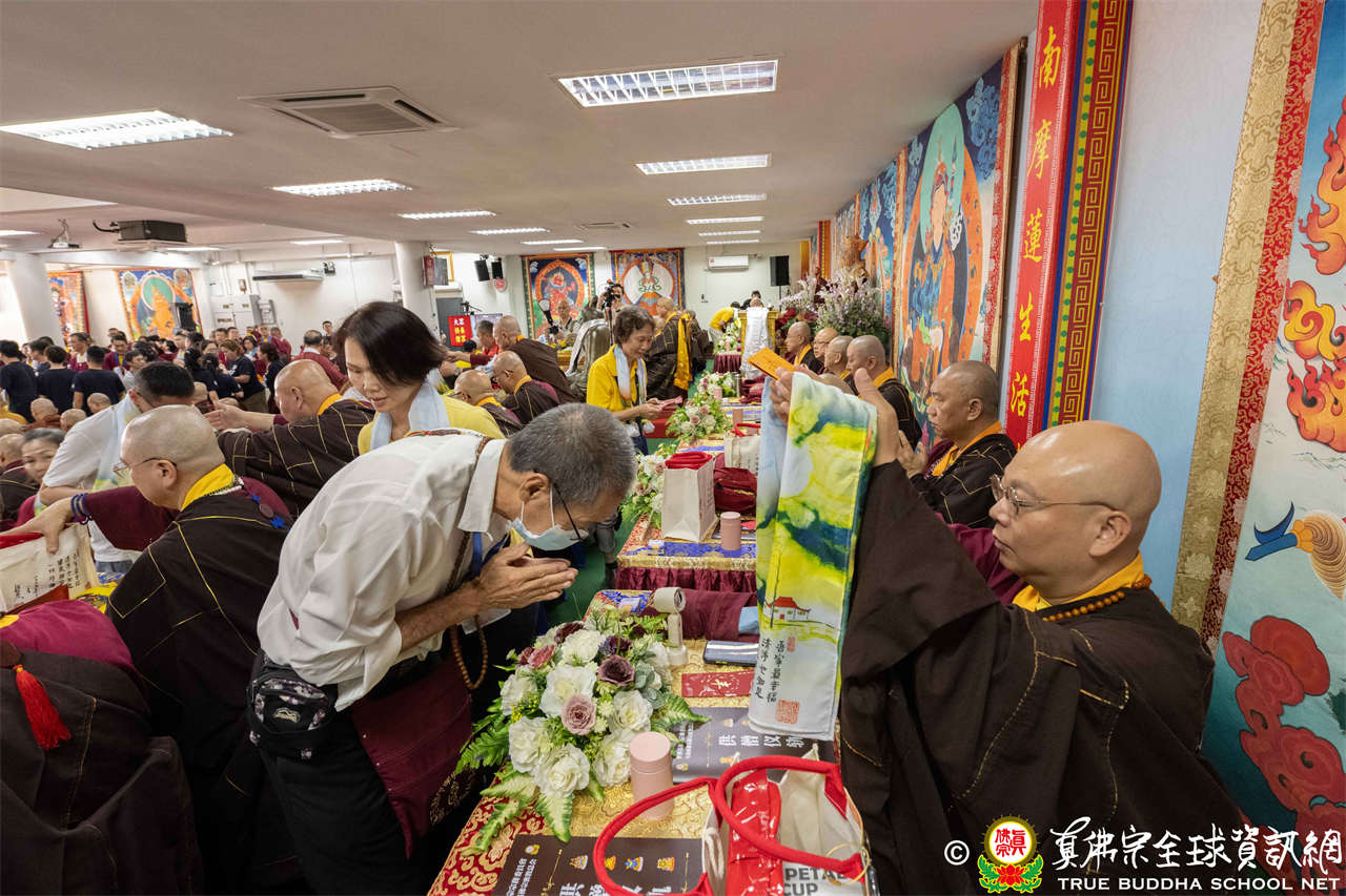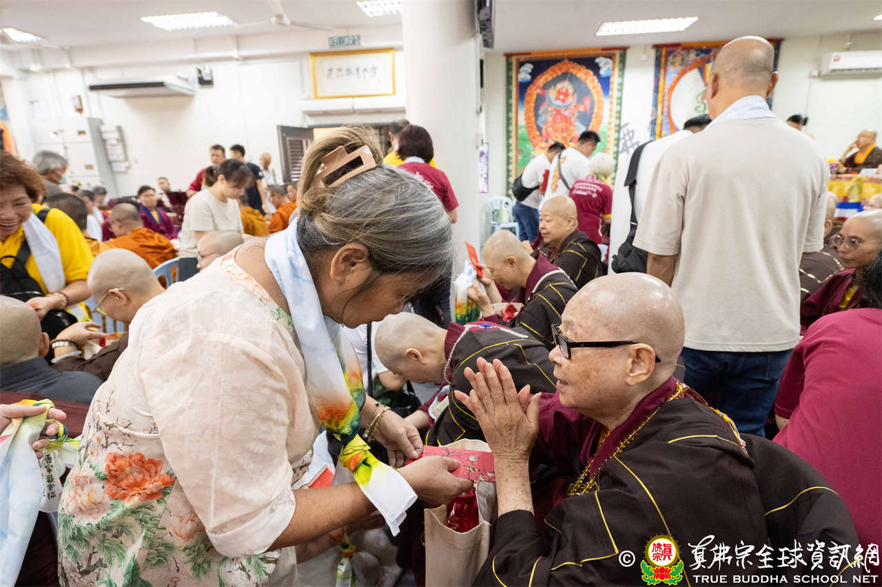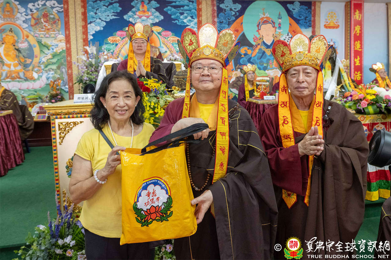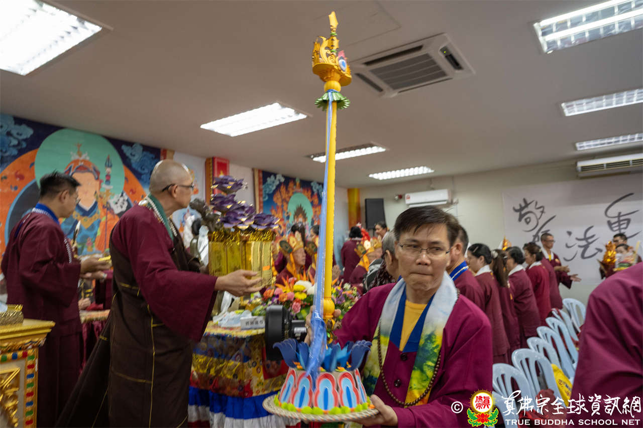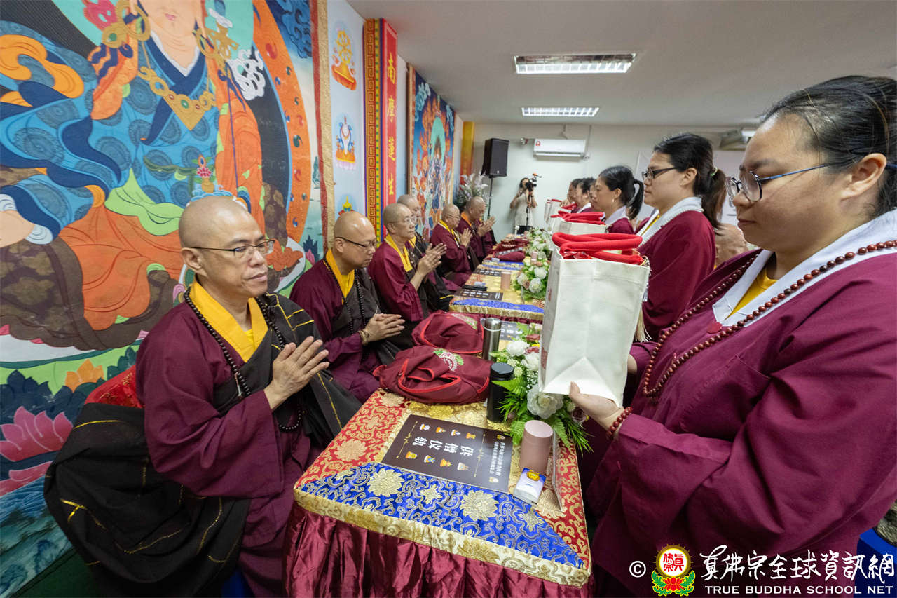 供僧大會依循《真佛宗供僧儀軌》肅穆進行,由長老釋蓮栽上師代表根本上師聖尊蓮生活佛盧勝彥納受信眾供養,並代表供養住世羅漢賓頭盧尊者。全體真佛弟子齊聲念誦《請佛住世祈願文》,祈請根本上師常住世間、永轉法輪;現場亦有南傳僧人持誦巴利文《祈禱文》,北傳僧人念誦《大悲咒》及《心經》。隨後,眾同門善信向僧眾敬獻哈達與供養,並由釋蓮栽長老開示佛法,供僧大會圓滿。