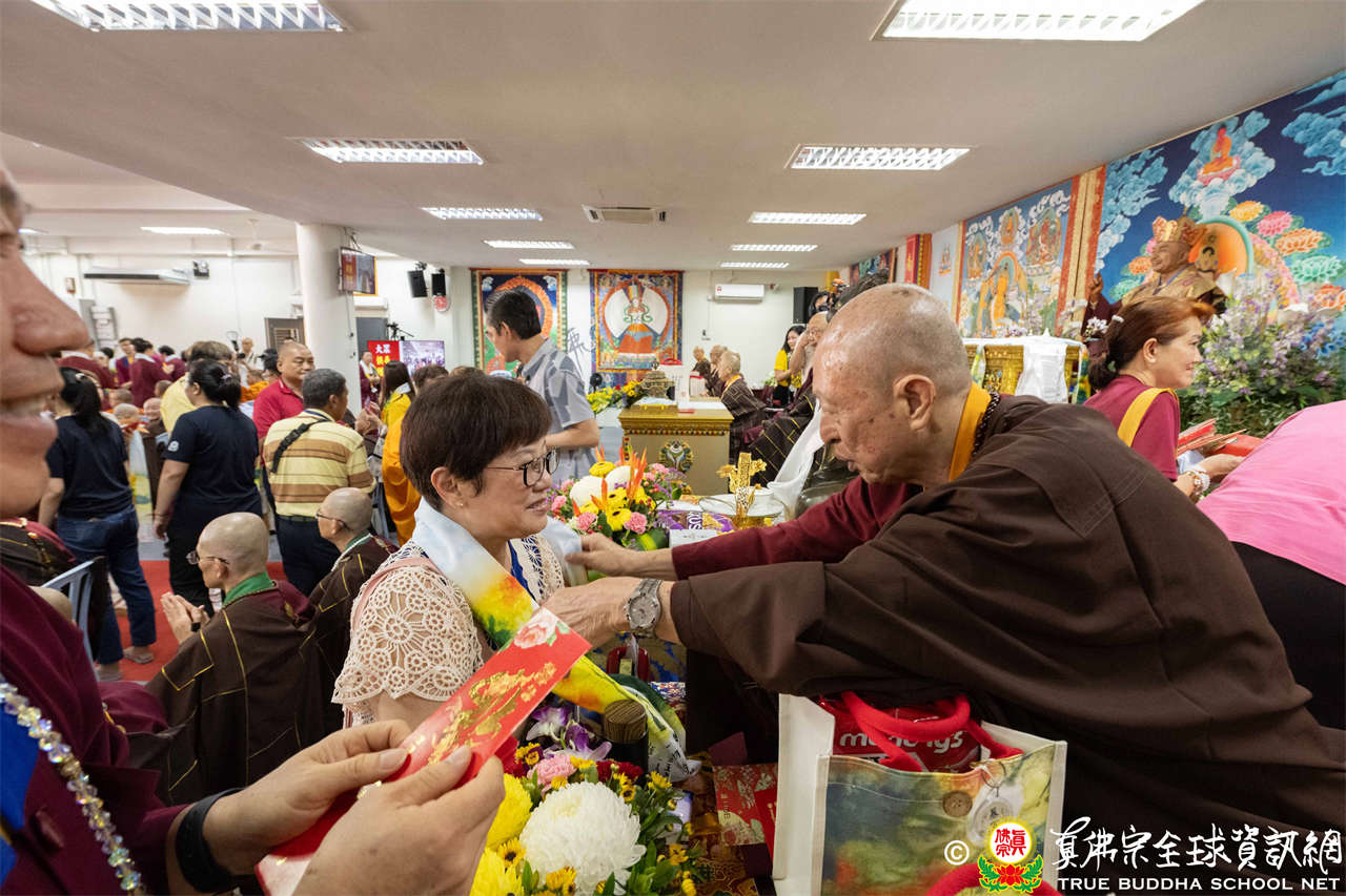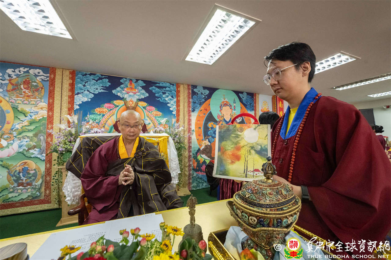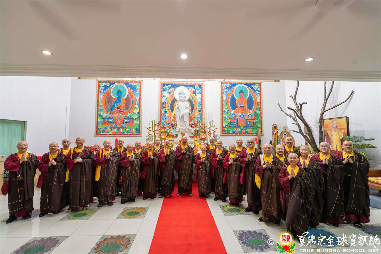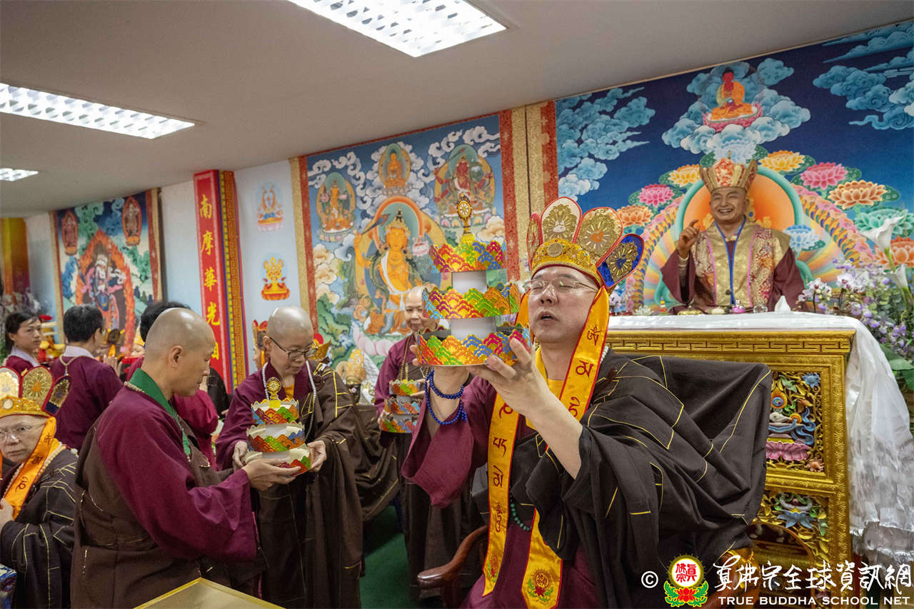 供僧大會依循《真佛宗供僧儀軌》肅穆進行,由長老釋蓮栽上師代表根本上師聖尊蓮生活佛盧勝彥納受信眾供養,並代表供養住世羅漢賓頭盧尊者。全體真佛弟子齊聲念誦《請佛住世祈願文》,祈請根本上師常住世間、永轉法輪;現場亦有南傳僧人持誦巴利文《祈禱文》,北傳僧人念誦《大悲咒》及《心經》。隨後,眾同門善信向僧眾敬獻哈達與供養,並由釋蓮栽長老開示佛法,供僧大會圓滿。