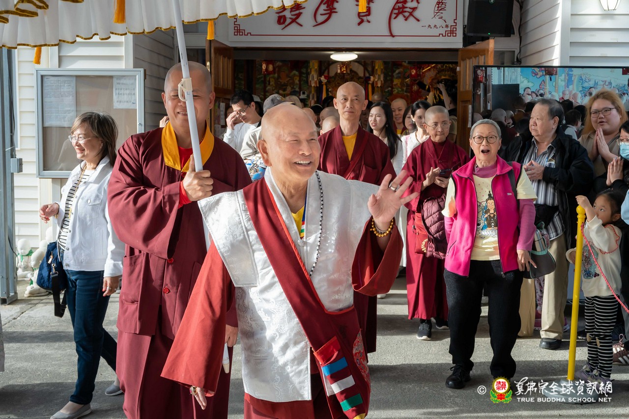 2026年4月19日,蓮生法王蒞臨彩虹雷藏寺,主壇殊勝的不空羂索觀音息災祈福超度護摩法會。適逢今日是師母陽曆生日,開示前,法王慈悲帶領大眾齊唱印尼版生日歌,現場洋溢著溫馨歡樂的氣氛,眾弟子同聲祝賀師母生日快樂。