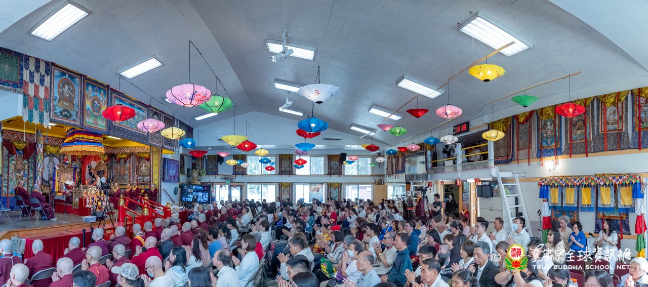 法王接著讚歎今日法會播放的不空羂索觀音咒音,並憶起前一晚西雅圖雷藏寺所播放的地藏王菩薩咒音,以及蓮花童子心咒音樂,皆出自巴西一對母女弟子之手——阿芳助教與其女兒可盈師姐所精心製作。法王表示,這些咒音極具感染力,能深深觸動人心,令聞者生起清淨與感動。