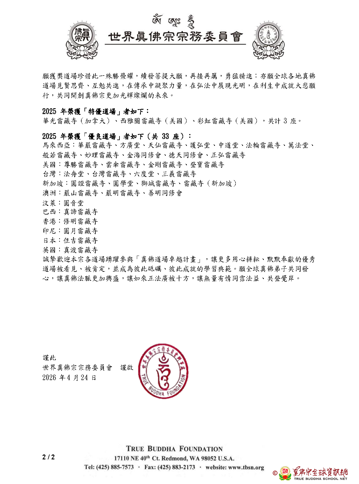 願獲獎道場珍惜此一殊勝榮耀,續發菩提大願,再接再厲,勇猛精進;亦願全球各地真佛道場見賢思齊、互勉共進,在傳承中凝聚力量,在弘法中展現光明,在利生中成就大悲願行,共同開創真佛宗更加光輝燦爛的未來。
