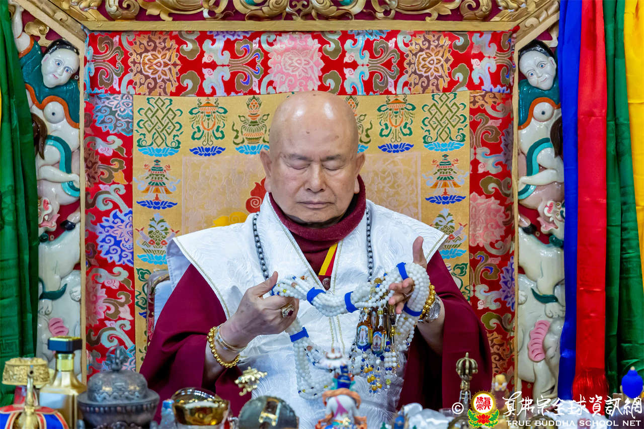 接著法王介紹此次法會主尊大白傘蓋佛母,其功德是:「得日月星斗擁戴、得吉祥賜福、可息、增、懷、誅、能鎮護國家,退怯强敵、遮止地水火風災難,威力無窮。其形象有獨尊的,也有千手千眼大白傘蓋佛母」。