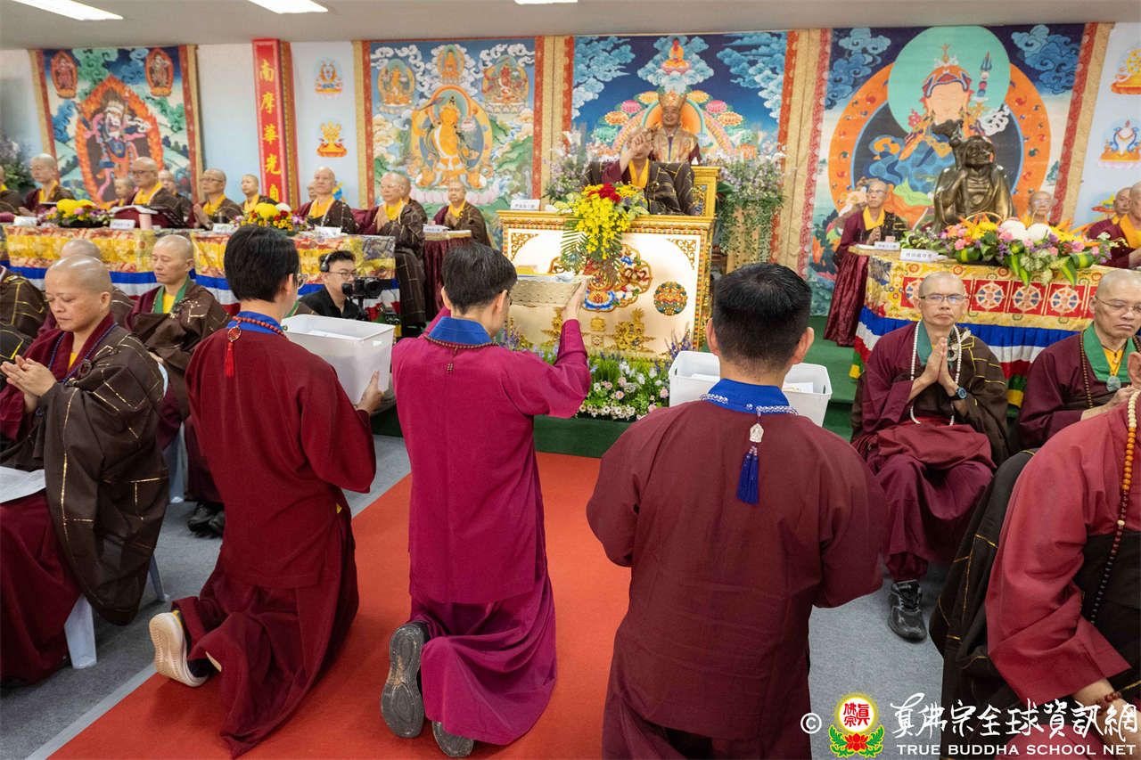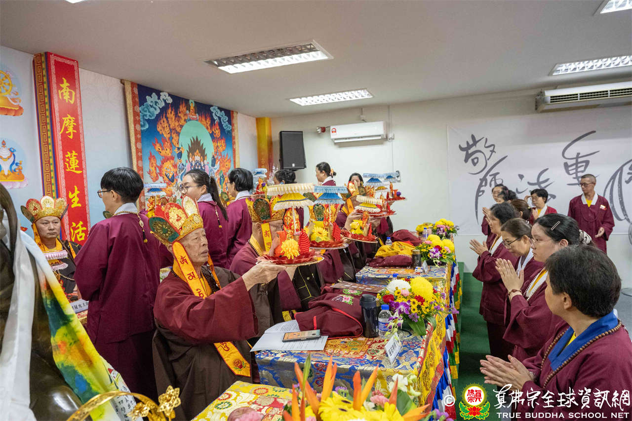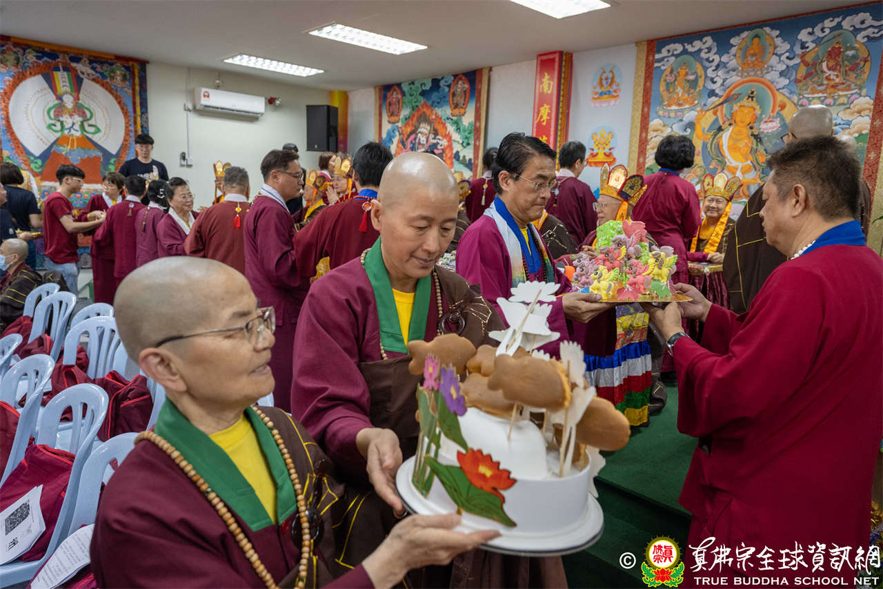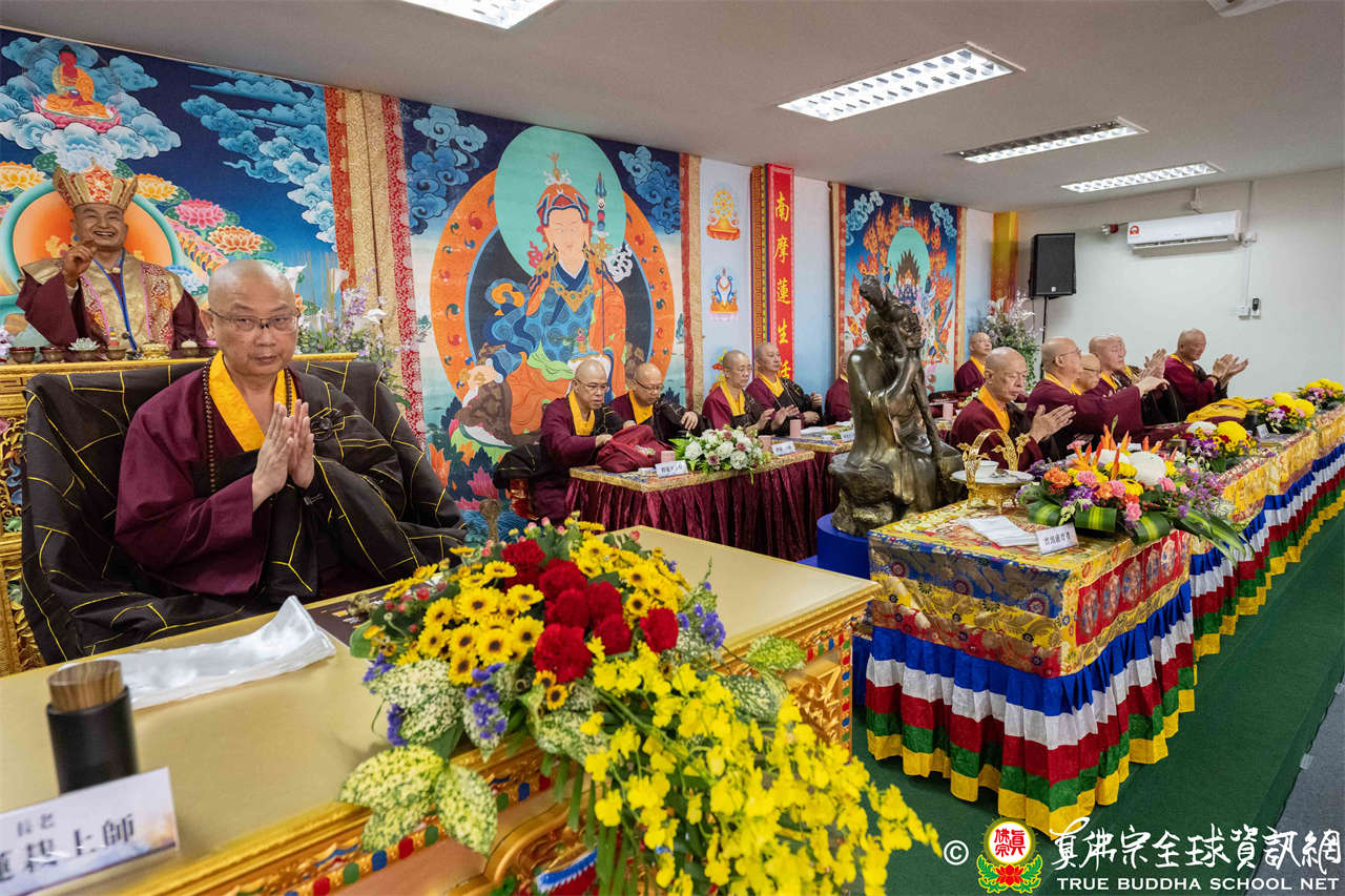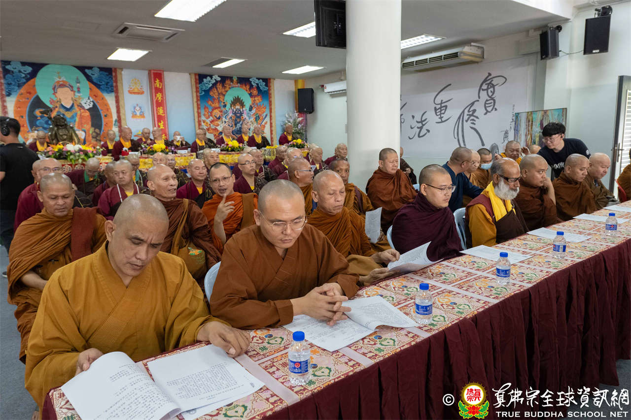 供僧大會依循《真佛宗供僧儀軌》肅穆進行,由長老釋蓮栽上師代表根本上師聖尊蓮生活佛盧勝彥納受信眾供養,並代表供養住世羅漢賓頭盧尊者。全體真佛弟子齊聲念誦《請佛住世祈願文》,祈請根本上師常住世間、永轉法輪;現場亦有南傳僧人持誦巴利文《祈禱文》,北傳僧人念誦《大悲咒》及《心經》。隨後,眾同門善信向僧眾敬獻哈達與供養,並由釋蓮栽長老開示佛法,供僧大會圓滿。