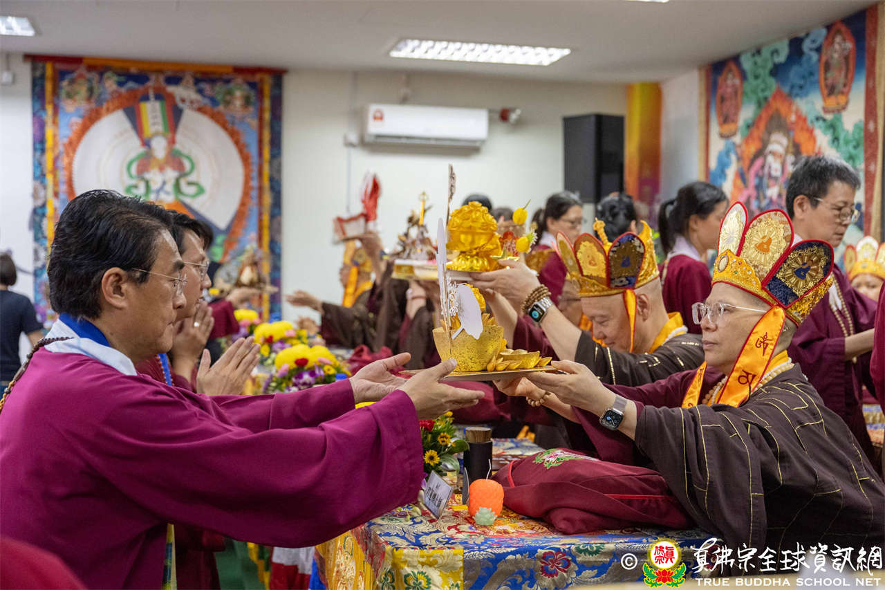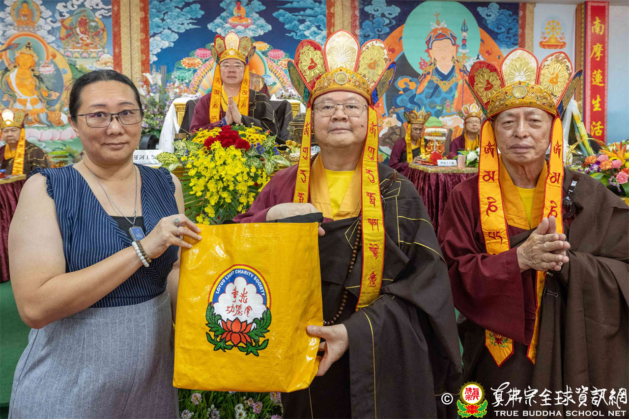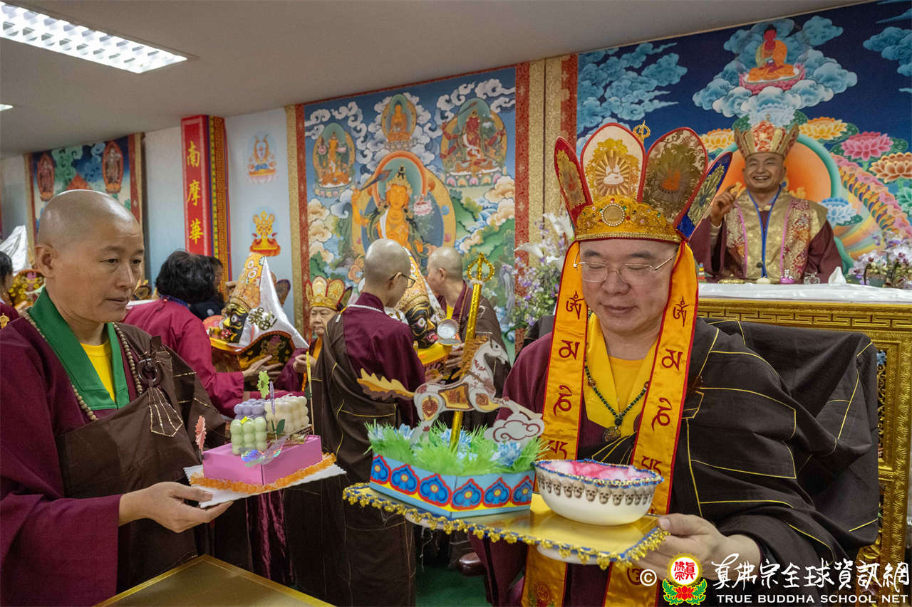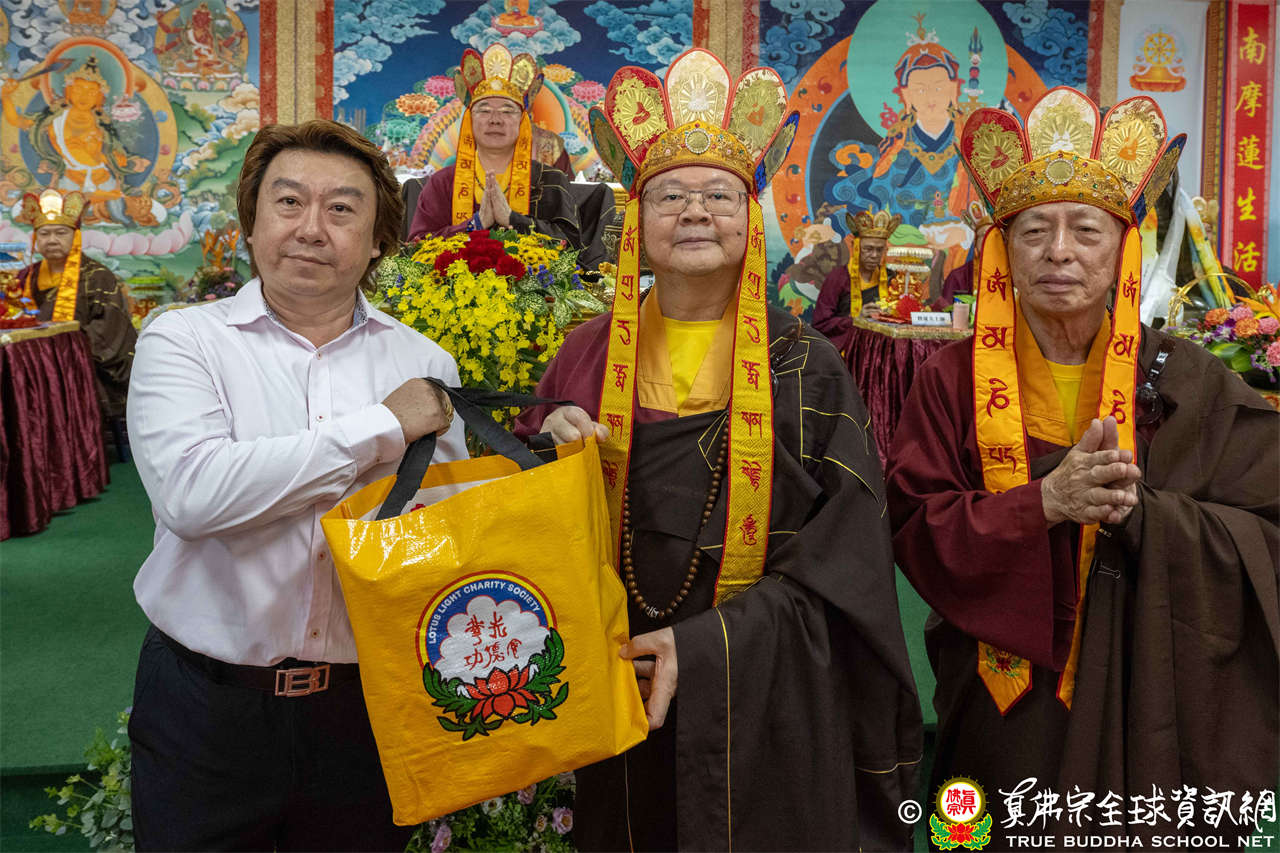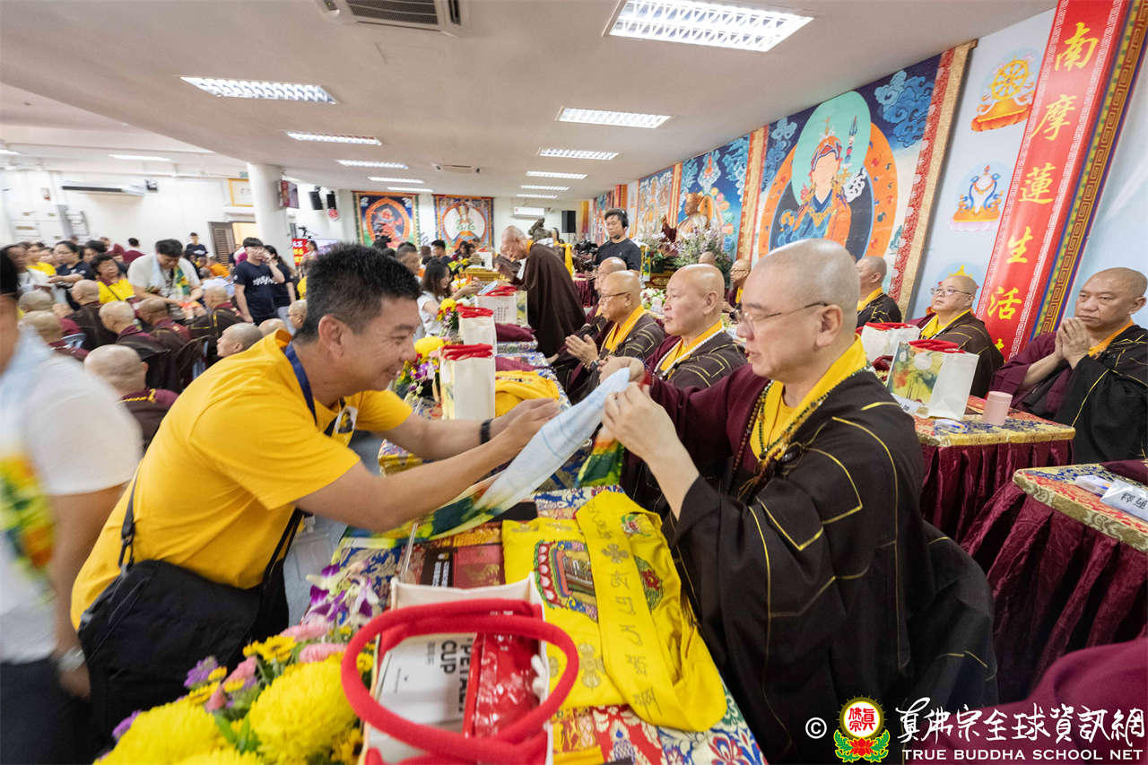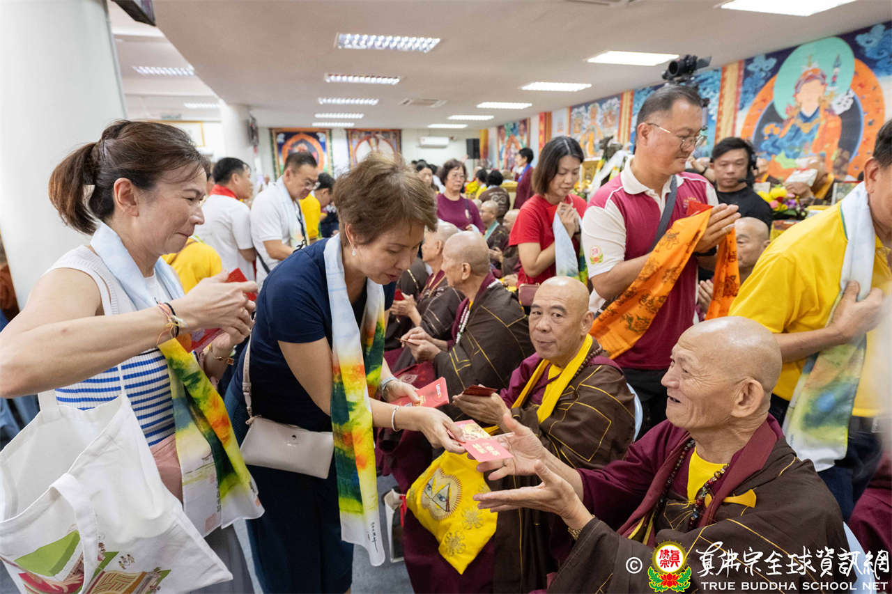 供僧大會依循《真佛宗供僧儀軌》肅穆進行,由長老釋蓮栽上師代表根本上師聖尊蓮生活佛盧勝彥納受信眾供養,並代表供養住世羅漢賓頭盧尊者。全體真佛弟子齊聲念誦《請佛住世祈願文》,祈請根本上師常住世間、永轉法輪;現場亦有南傳僧人持誦巴利文《祈禱文》,北傳僧人念誦《大悲咒》及《心經》。隨後,眾同門善信向僧眾敬獻哈達與供養,並由釋蓮栽長老開示佛法,供僧大會圓滿。