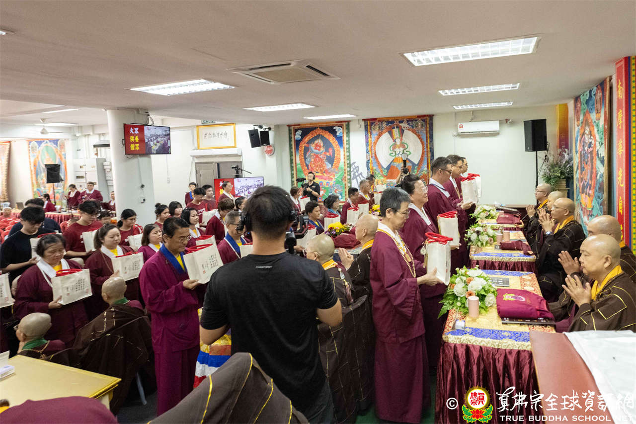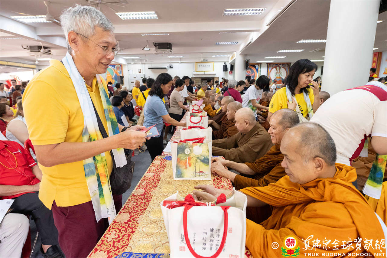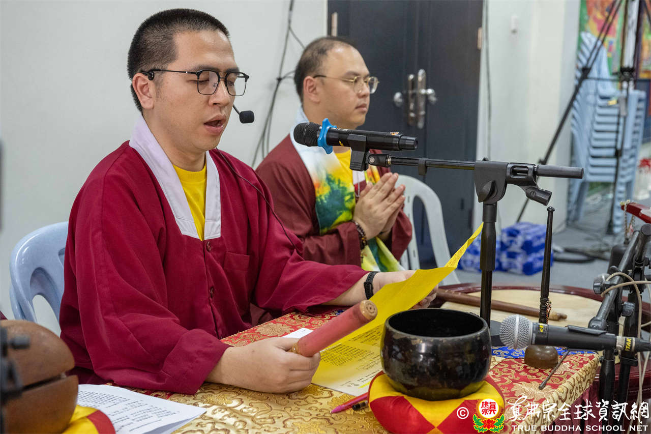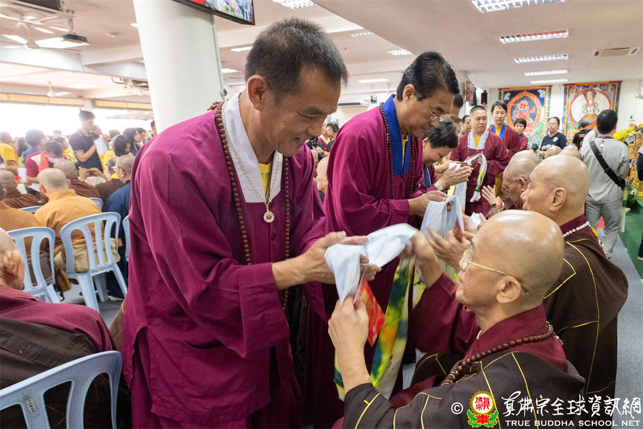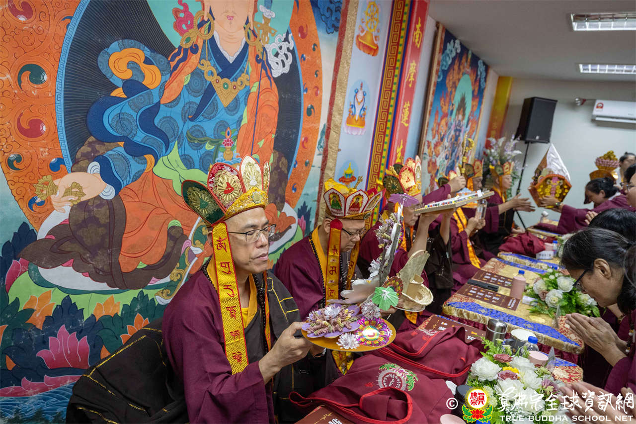 供僧大會依循《真佛宗供僧儀軌》肅穆進行,由長老釋蓮栽上師代表根本上師聖尊蓮生活佛盧勝彥納受信眾供養,並代表供養住世羅漢賓頭盧尊者。全體真佛弟子齊聲念誦《請佛住世祈願文》,祈請根本上師常住世間、永轉法輪;現場亦有南傳僧人持誦巴利文《祈禱文》,北傳僧人念誦《大悲咒》及《心經》。隨後,眾同門善信向僧眾敬獻哈達與供養,並由釋蓮栽長老開示佛法,供僧大會圓滿。