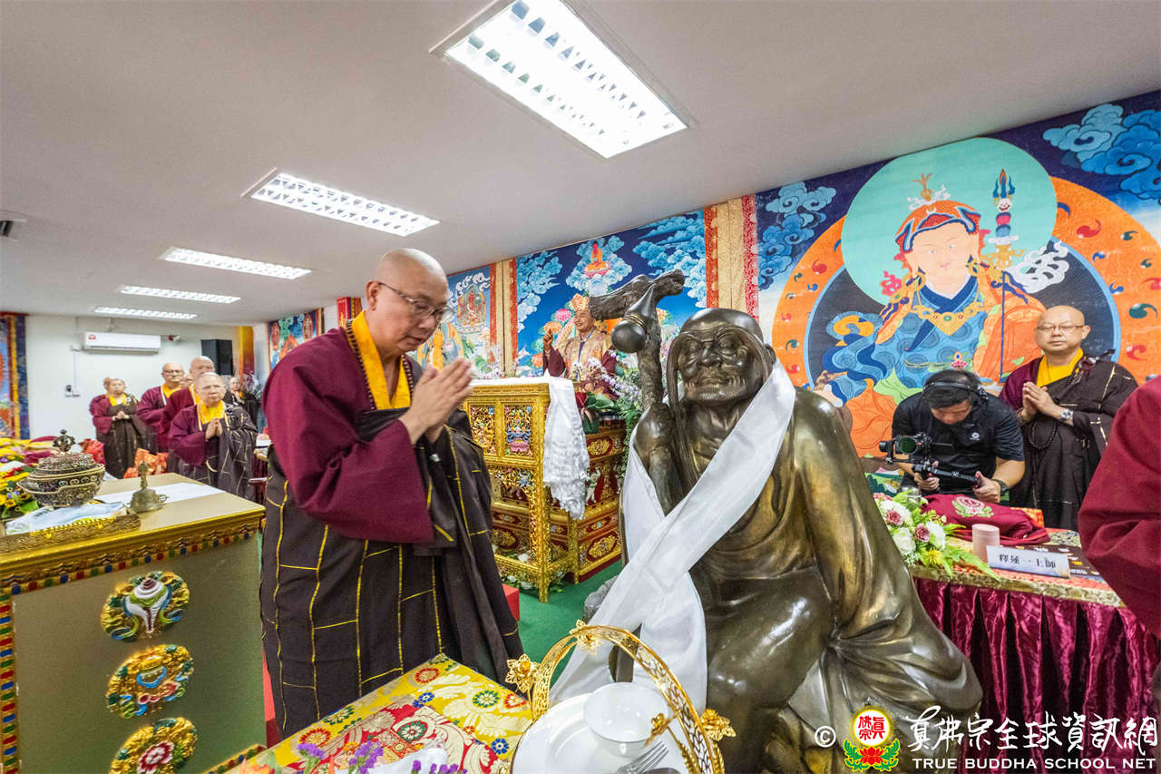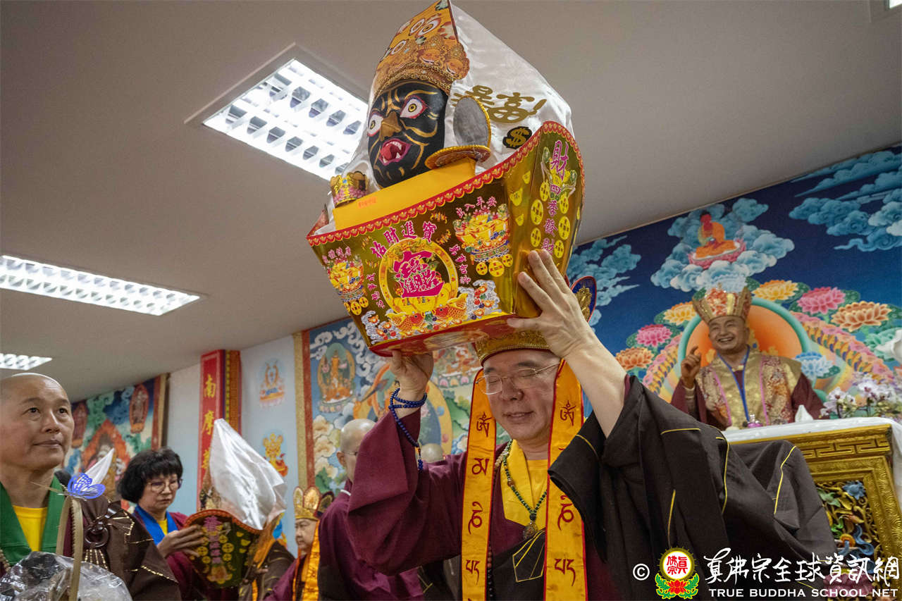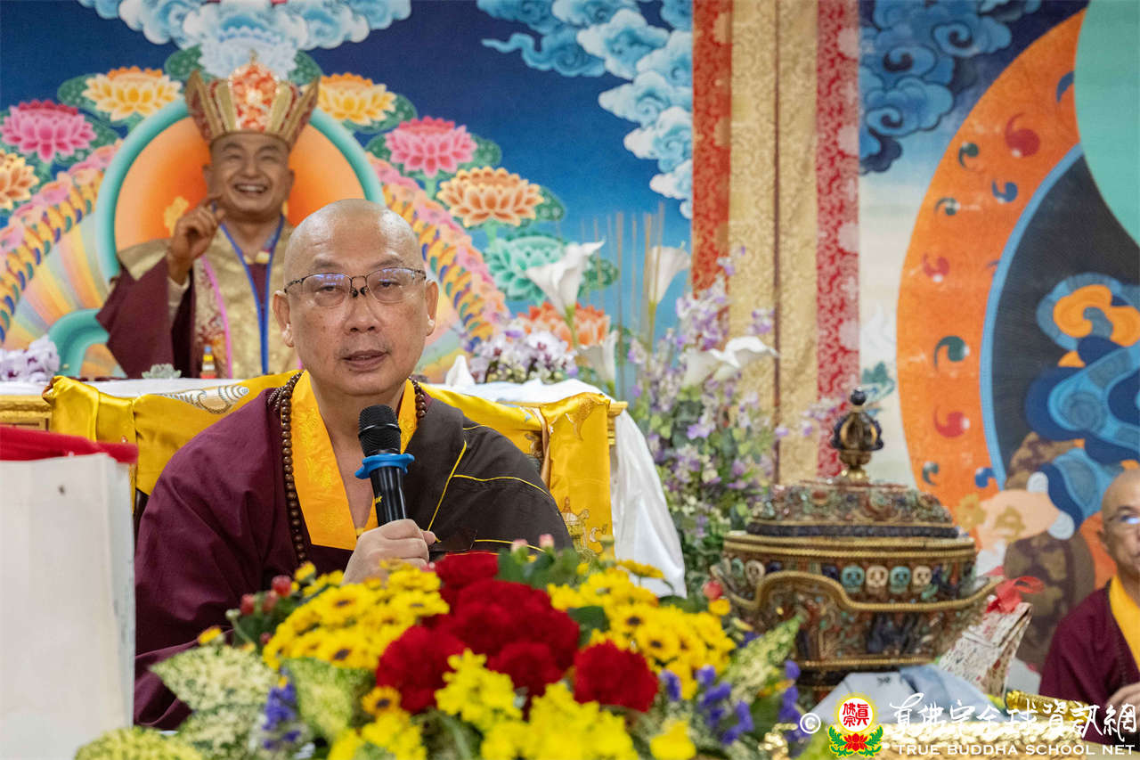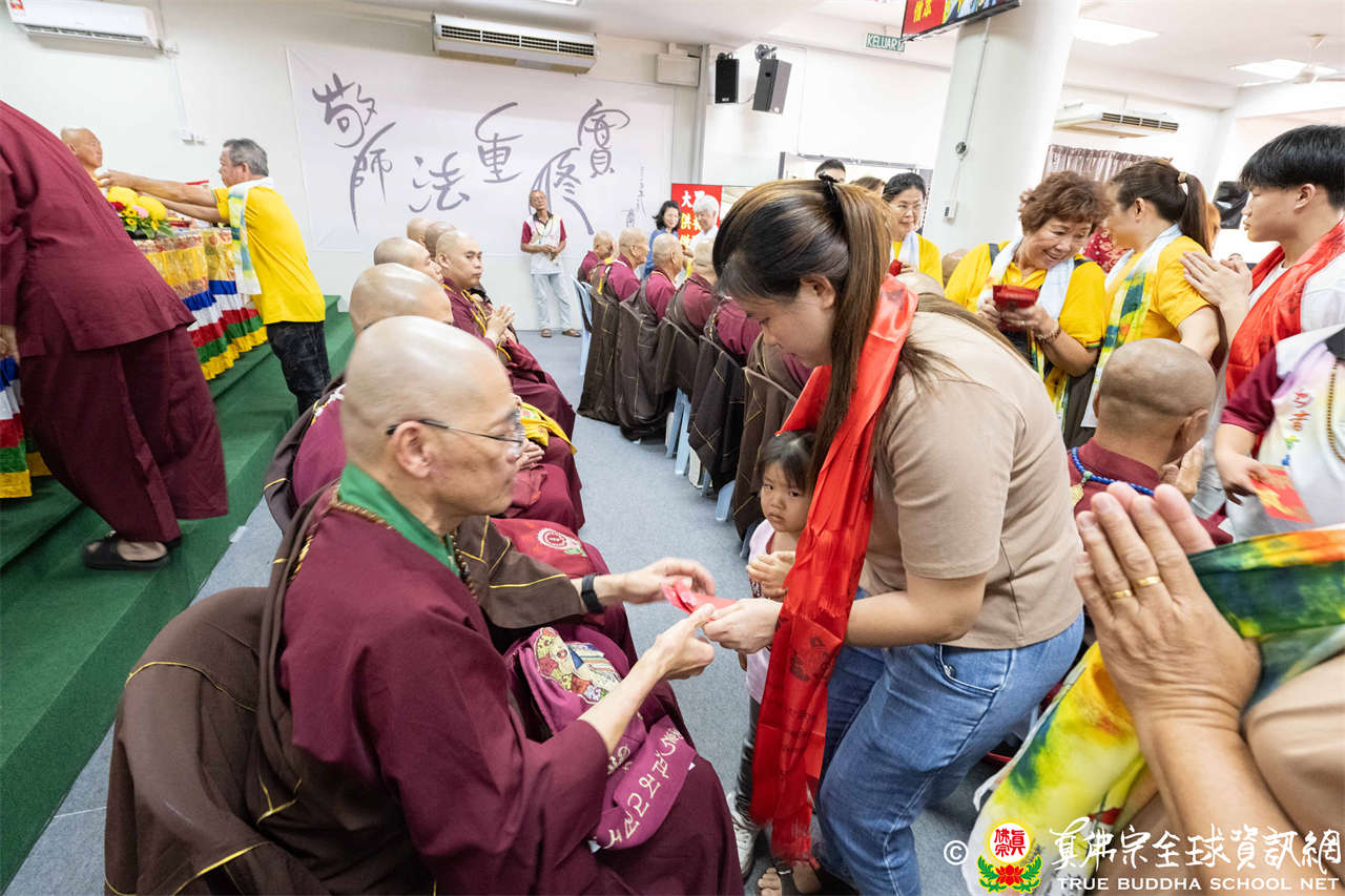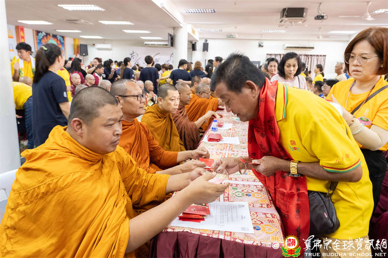 供僧大會依循《真佛宗供僧儀軌》肅穆進行,由長老釋蓮栽上師代表根本上師聖尊蓮生活佛盧勝彥納受信眾供養,並代表供養住世羅漢賓頭盧尊者。全體真佛弟子齊聲念誦《請佛住世祈願文》,祈請根本上師常住世間、永轉法輪;現場亦有南傳僧人持誦巴利文《祈禱文》,北傳僧人念誦《大悲咒》及《心經》。隨後,眾同門善信向僧眾敬獻哈達與供養,並由釋蓮栽長老開示佛法,供僧大會圓滿。