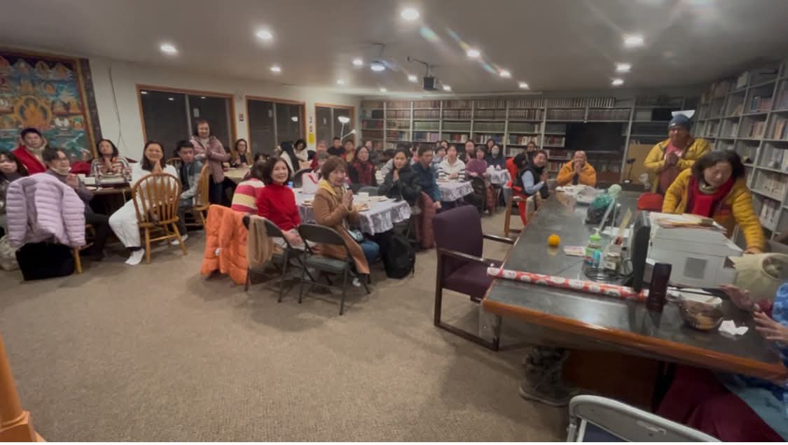 每逢除夕,西雅圖雷藏寺皆舉辦溫馨的圍爐聚餐,讓海內外善信歡聚一堂,互道新年快樂。今年同樣座無虛席,住持蓮吟上師還特地拍攝大眾用餐的短片,說要呈請師尊、師母觀看。只見現場人人對著鏡頭,熱情的向師尊、師母喊出誠摯的祝福,字字句句滿含無限的孺慕之情。