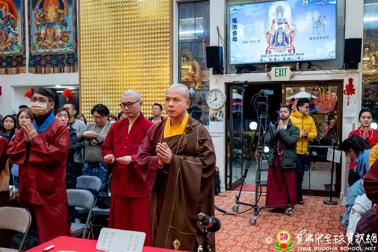 雖然天寒地凍,大眾仍虔敬的熱忱參與,跟隨著蓮吟上師做禮拜、獻供、誦經、持咒、入定、回向,人人全神貫注的修法,祈求瑤池金母大天尊、阿彌陀佛、諸佛菩薩護法金剛佛光注照,聖尊與師母都健健康康的早日和弟子們團聚在西雅圖雷藏寺。