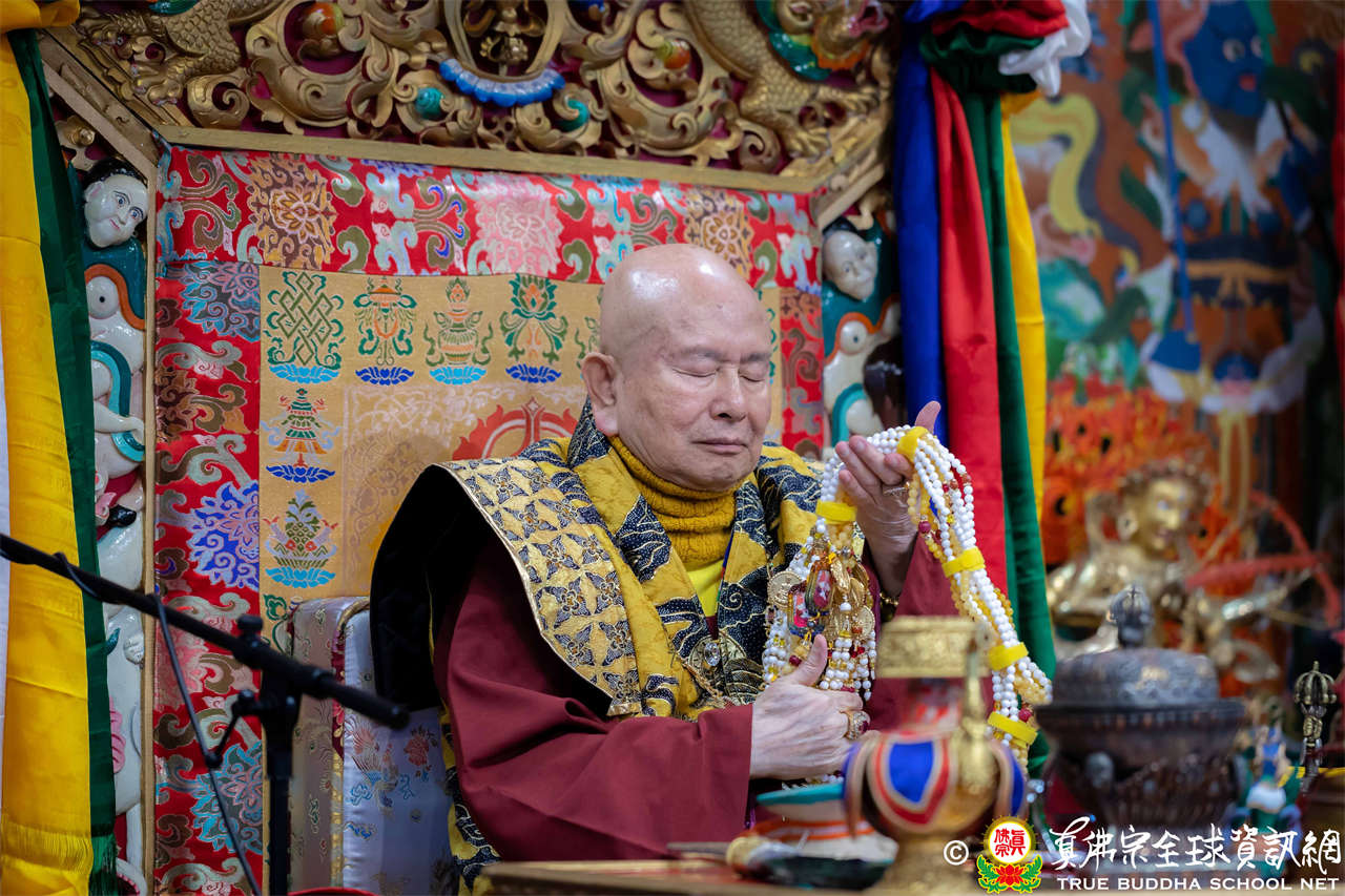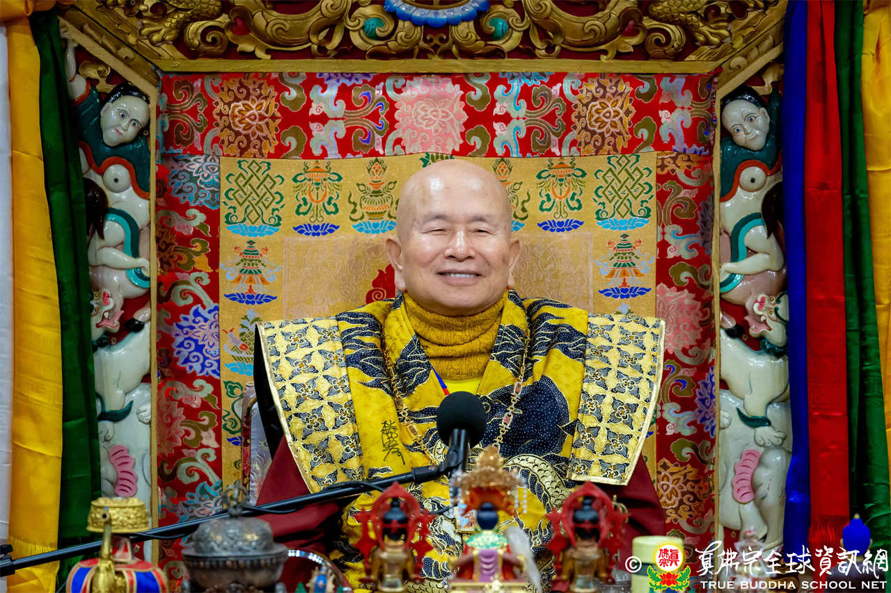 接著,法王繼續講解《大佛頂首楞嚴經》〈卷第四〉:「無上大悲清淨寶王,善開我心。能以如是種種因緣,方便提獎,引諸沈冥出於苦海。世尊。我今雖承如是法音,知如來藏妙覺明心遍十方界,含育如來十方國土,清淨寶嚴妙覺王剎。如來復責多聞無功,不逮修習。我今猶如旅泊之人,忽蒙天王賜與華屋,雖獲大宅,要因門入。惟願如來不捨大悲,示我在會諸蒙暗者,捐捨小乘,畢獲如來無餘涅槃本發心路。令有學者,從何攝伏疇昔攀緣,得陀羅尼,入佛知見。作是語已,五體投地。在會一心,佇佛慈旨。」