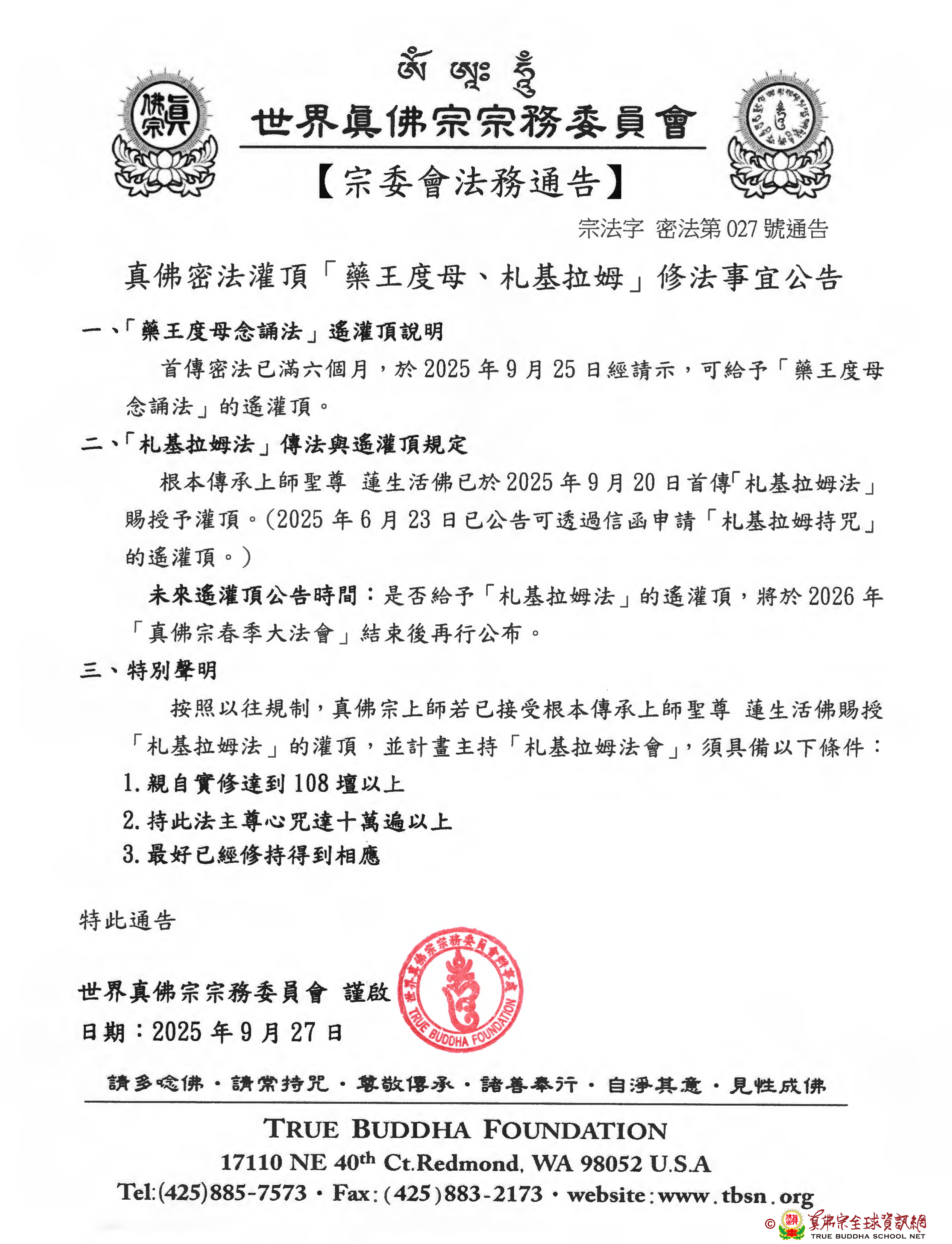 未來遙灌頂公告時間:是否給予「札基拉姆法」遙灌頂,將於2026年「真佛宗春季大法會」結束後再行公布。