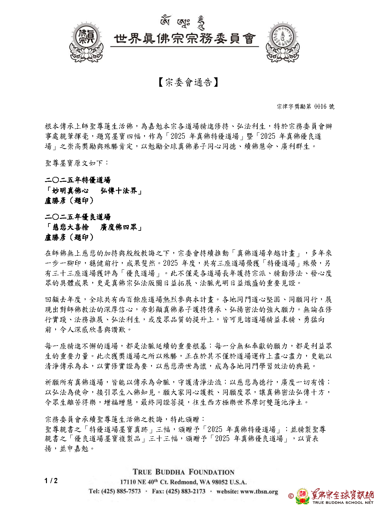 聖尊親書之「特優道場墨寶真跡」三幅,頒贈予「2025年真佛特優道場」;並精製聖尊親書之「優良道場墨寶複製品」三十三幅,頒贈予「2025年真佛優良道場」,以資表揚,並申嘉勉。